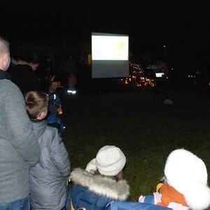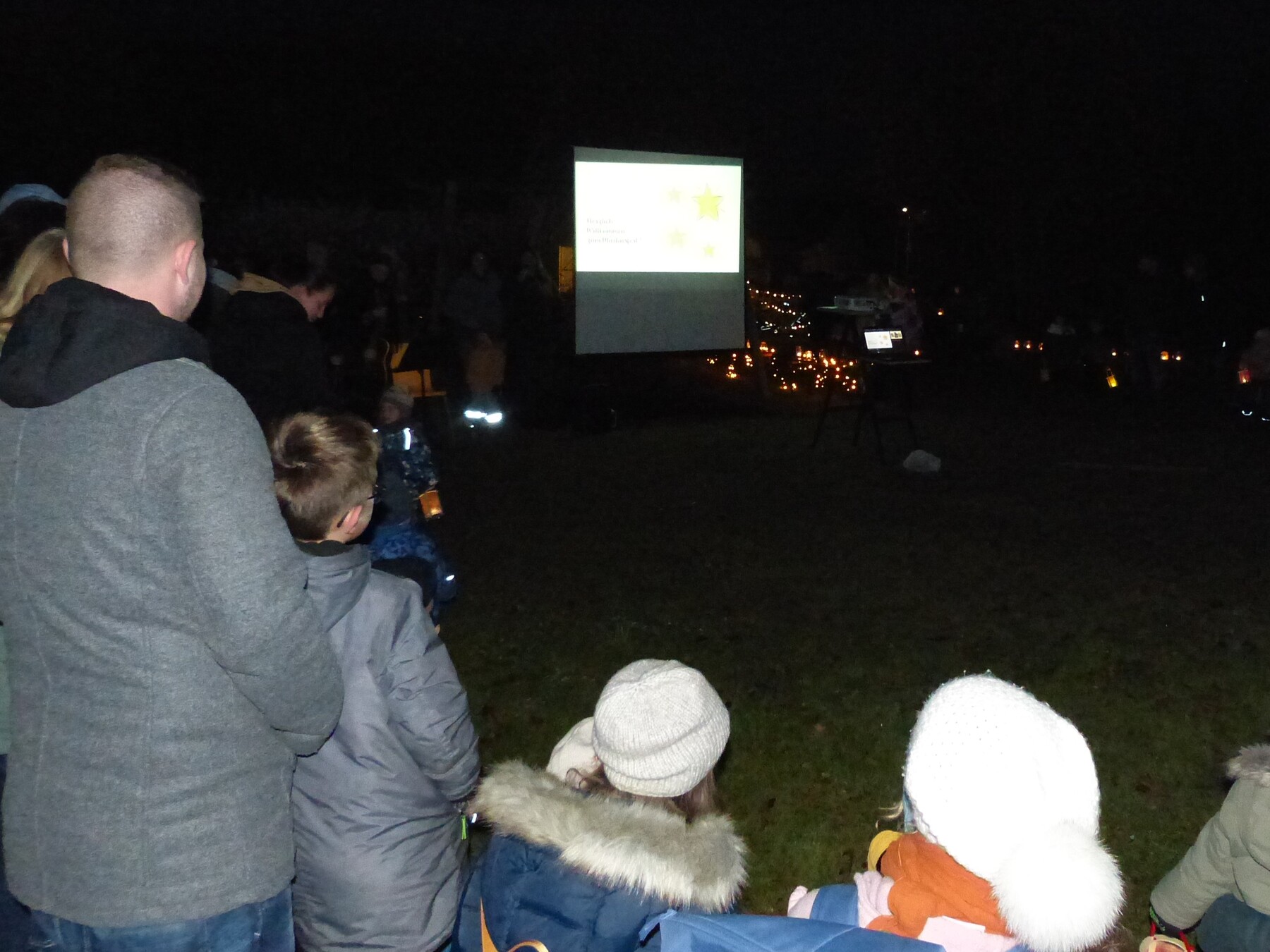 Nach den Begrüßungsworten hörten wir die Geschichte von Sankt Martin, der seinen Mantel mit einem Bettler teilte. Die Erzählung hatten wir zuvor mit den Kindern nachgespielt und die Fotos per Beamer gezeigt. Anschließend sangen wir gemeinsam unsere Laternenlieder, begleitet von Gitarren, einer Querflöte und einem Cajón.