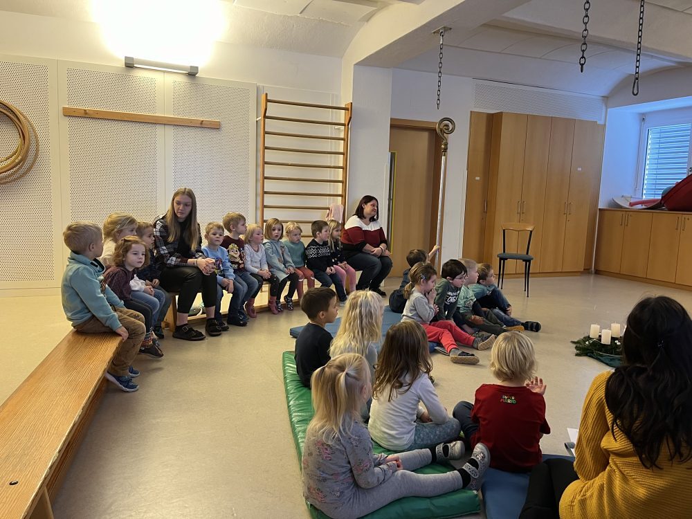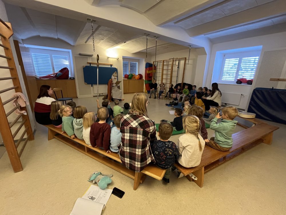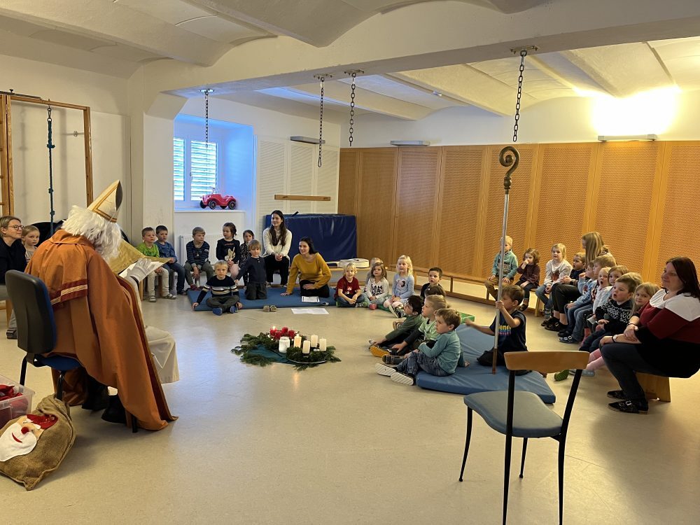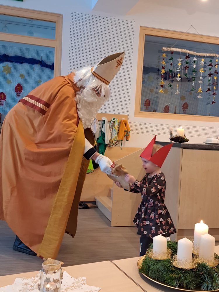 Danach führte ihn seine Reise zu den Kindergartenkindern, die im Turnsaal schon gespannt warteten. Die Kinder hatten Lieder, Gedichte und Zeichnungen für ihn vorbereitet. Darüber freute sich der Hl. Nikolaus sehr und gab daraufhin jedem Kind persönlich sein prall gefülltes Sackerl. Nachdem sich der Hl. Nikolaus am Vormittag wieder von allen verabschiedet hatte, verspeisten die Kinder noch leckere Brioche-Nikoläuse.
