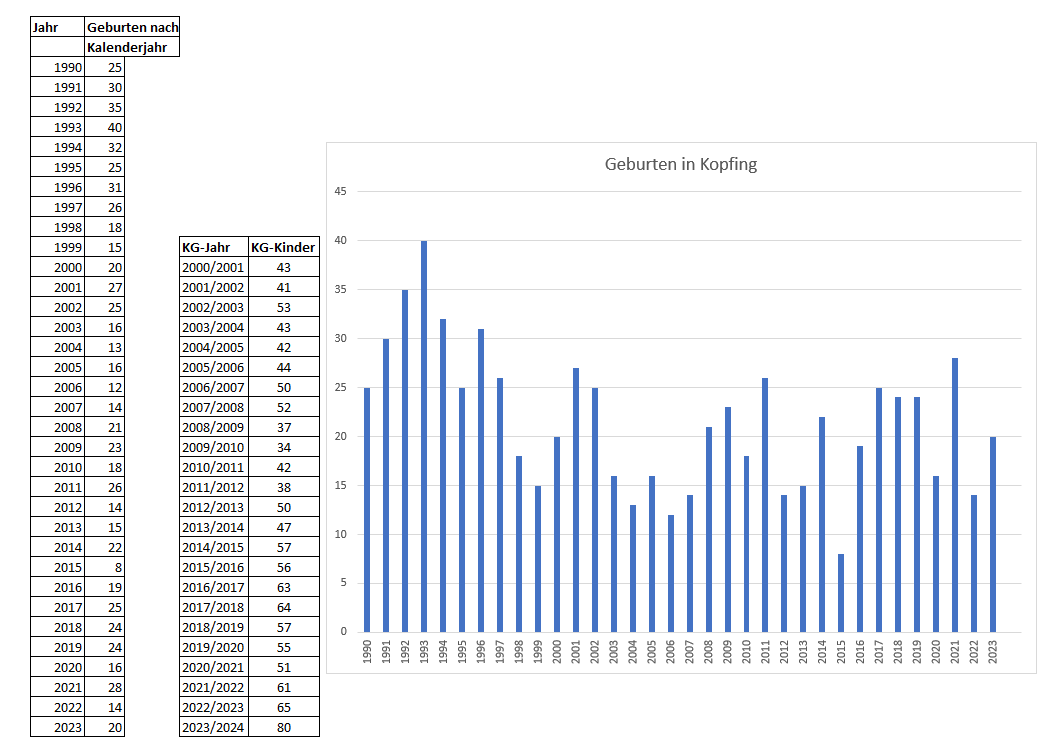 Die Entwicklung der Geburtenzahlen in Kopfing seit 1990 und die Anzahl der Kindergartenkinder der letzten 24 Jahre sind in der Grafik dargestellt.