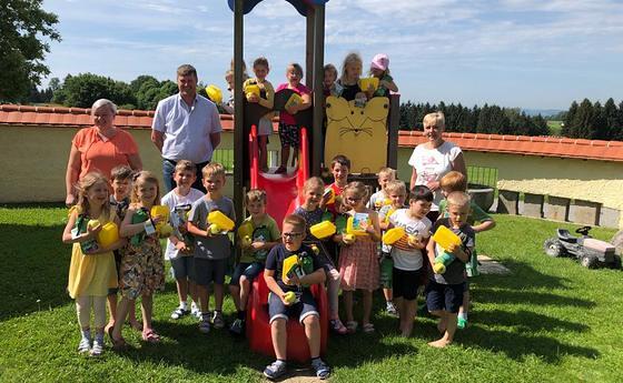 Am Ende eines jeden Arbeitsjahres überrascht uns der Bürgermeister und der Umweltausschuss der Marktgemeinde Kopfing mit einem Besuch im Kindergarten. Jede*r Schulanfänger*in wird mit einer Jausenbox, einer Trinkflasche und einem Apfel beschenkt.