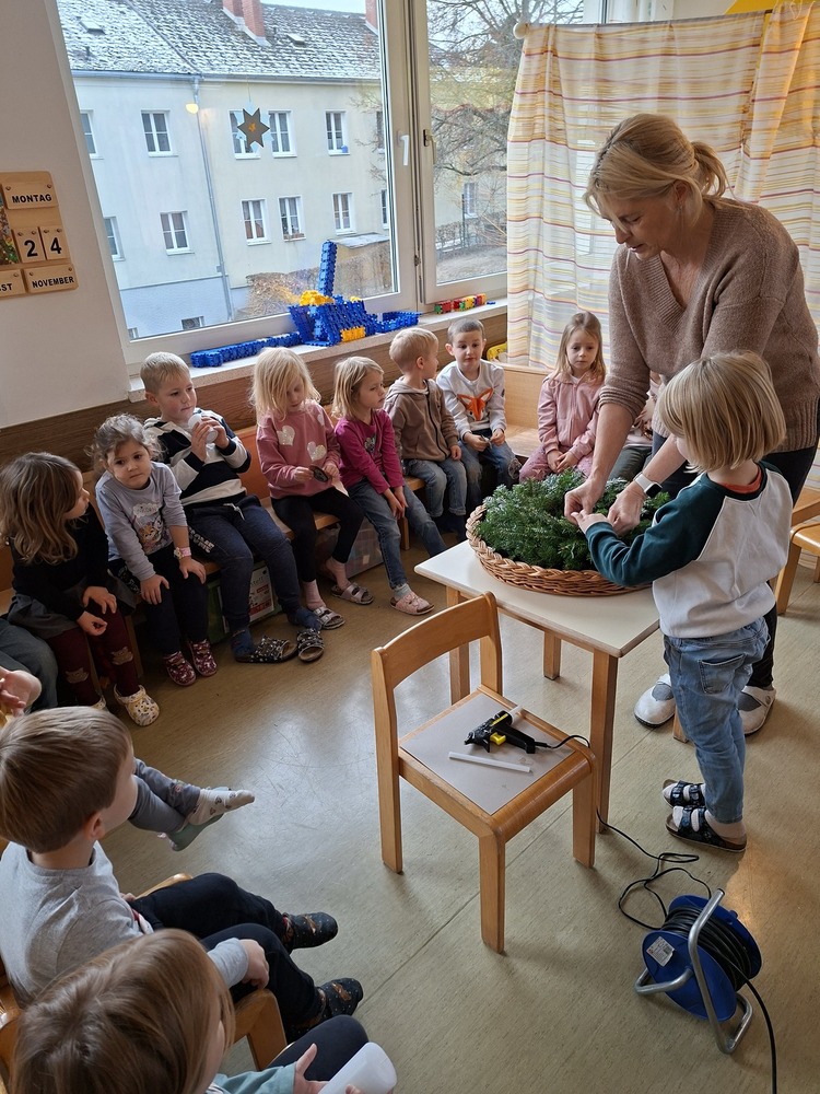 Bevor der Advent begann, wurde in jeder Gruppe ein Adventkranz gebunden. Dieser stellt anschließend täglich den Mittelpunkt unseres Advent-Morgenkreises dar.