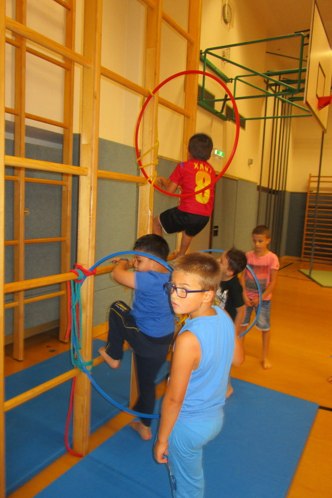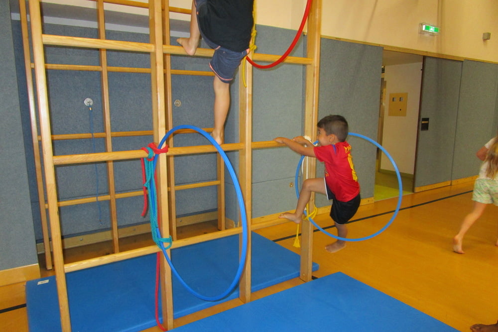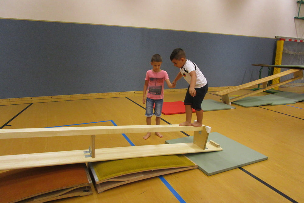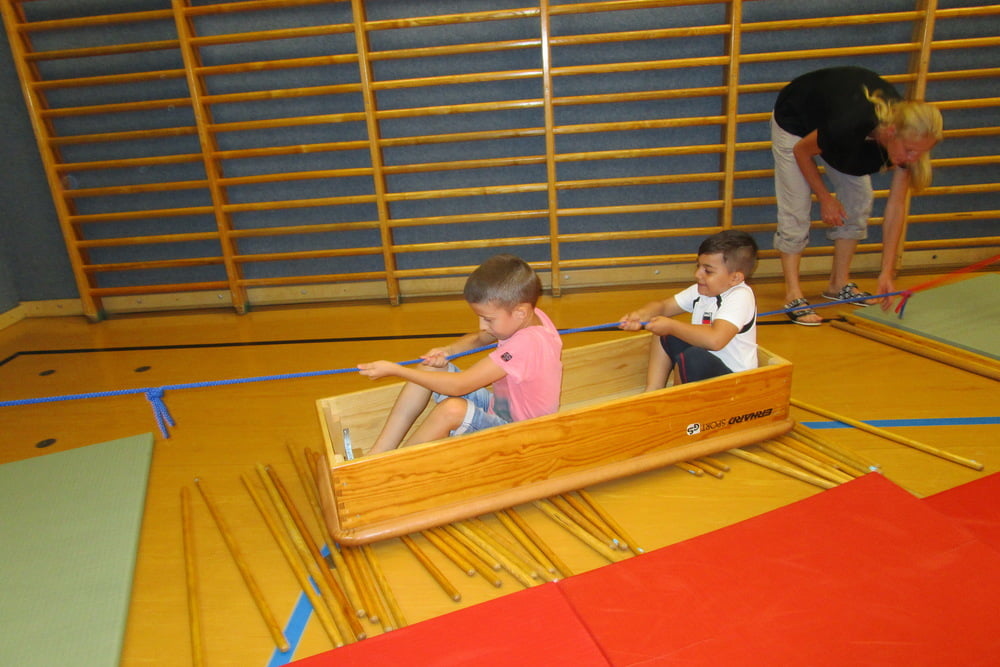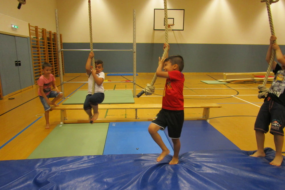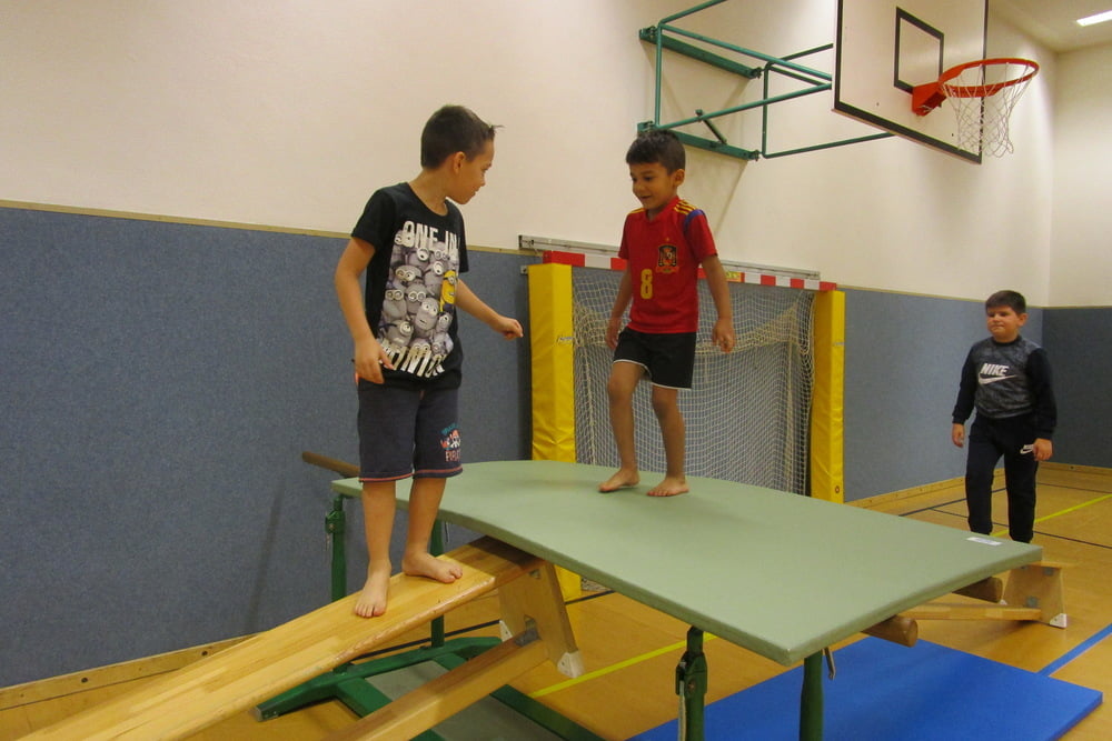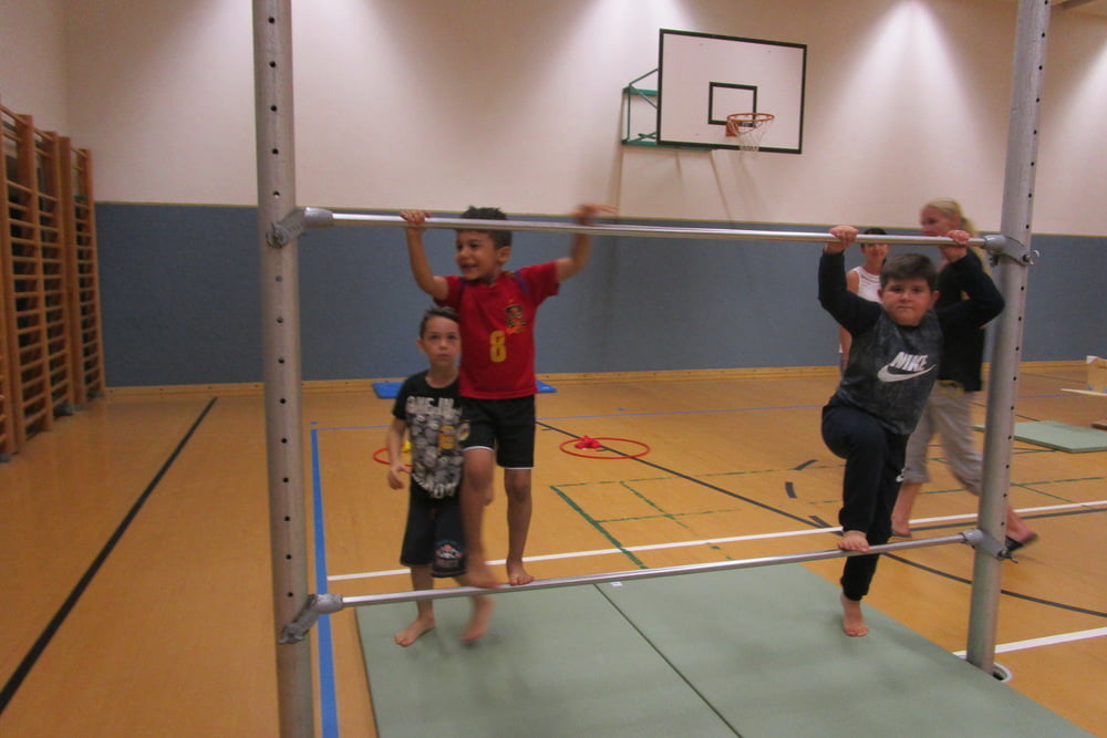Unsere Schulanfänger durften auf Einladung die Turngeräte des großen Turnsaales in der Jahnschule probieren.