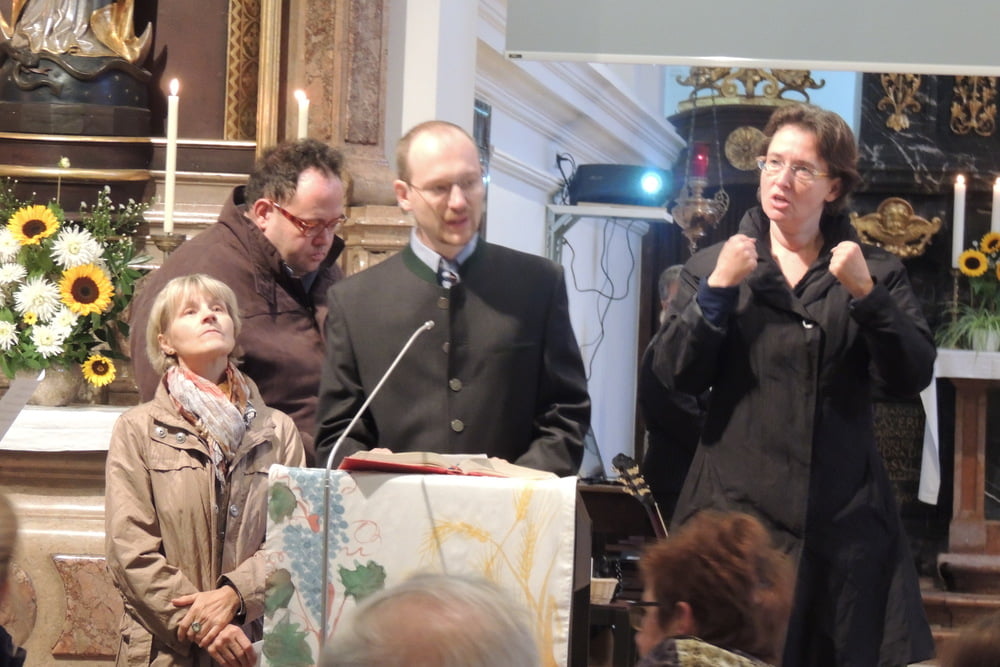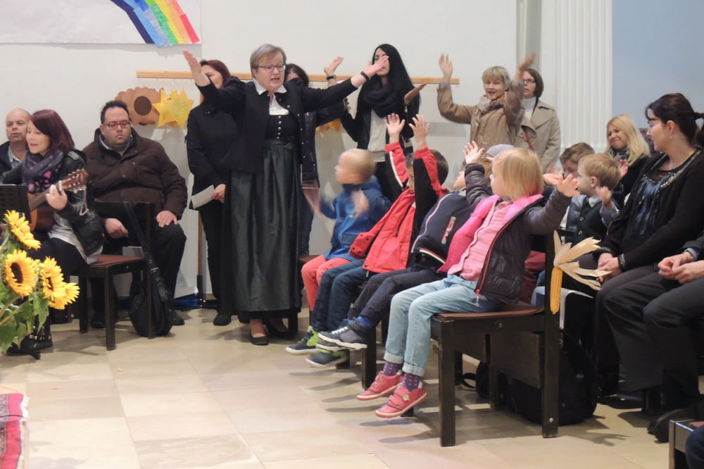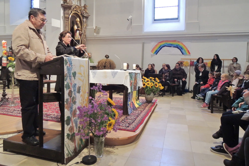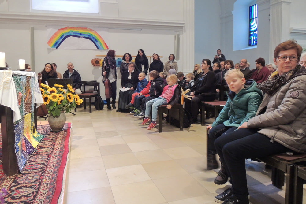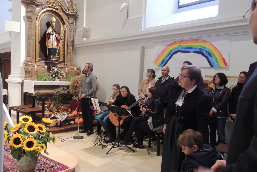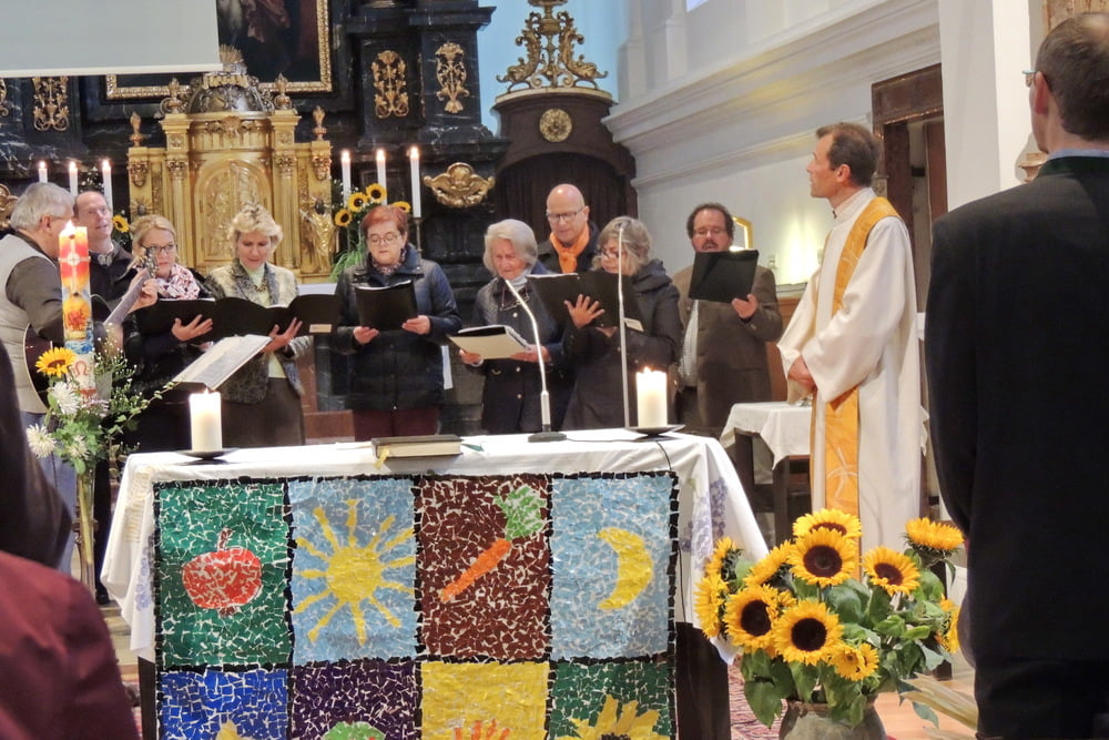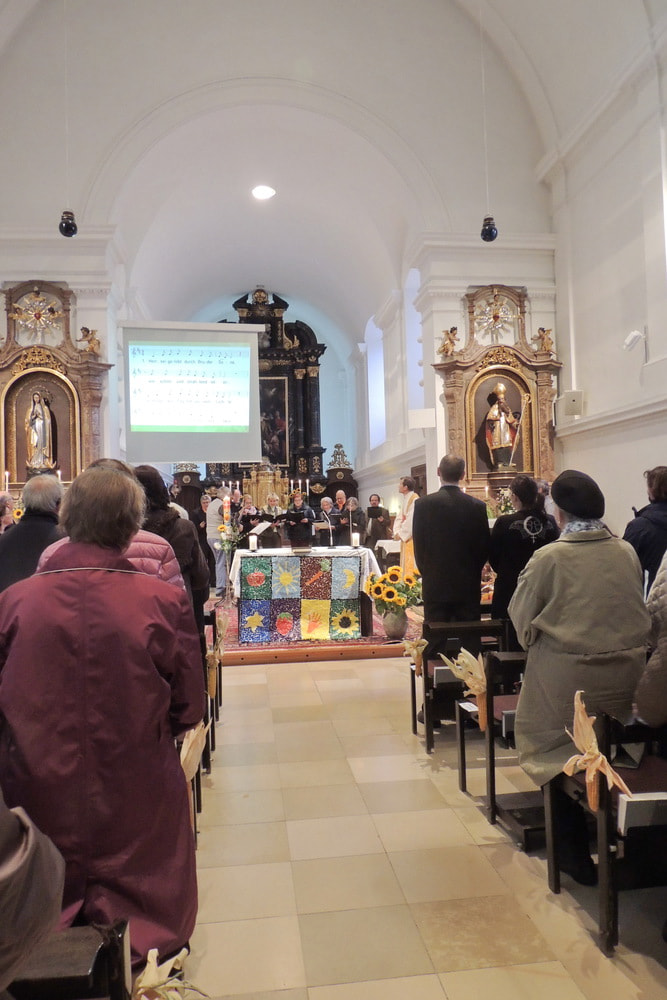Der Familienchor unserer Pfarre sang die Zwischenstrophen und so lobten und dankten wir alle Gott aus ganzem Herzen. Auch das Lied von der Sonnenblume, die den Kopf zur Sonne dreht, untermalten wir mit Gesten. Zum Schluss sangen wir "Hinaus in die Welt". Wir wollten von Gottes Taten sprechen, den Frieden zu den Menschen bringen, von der Liebe singen und Freude bringen.