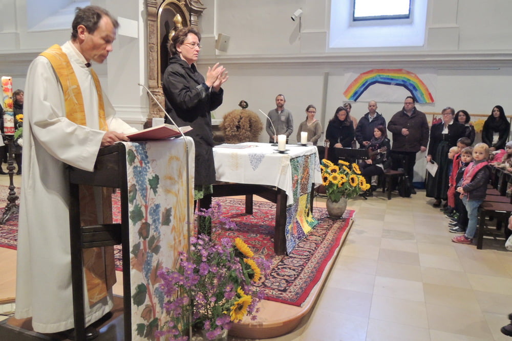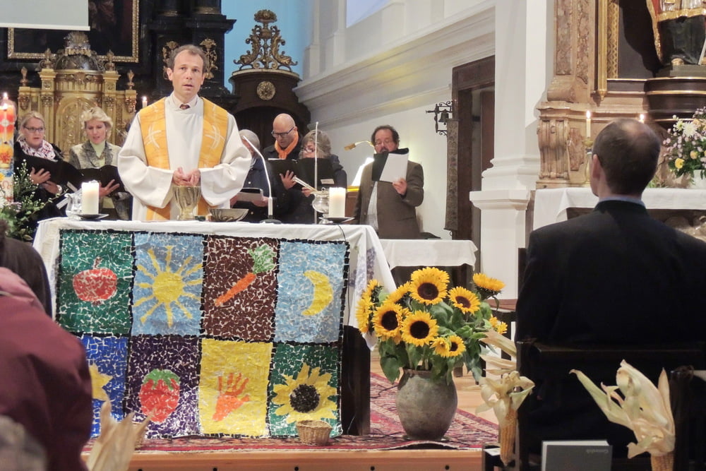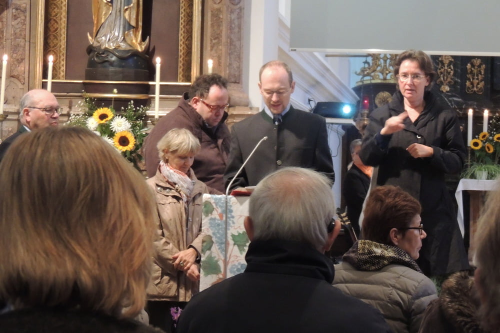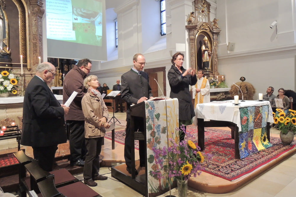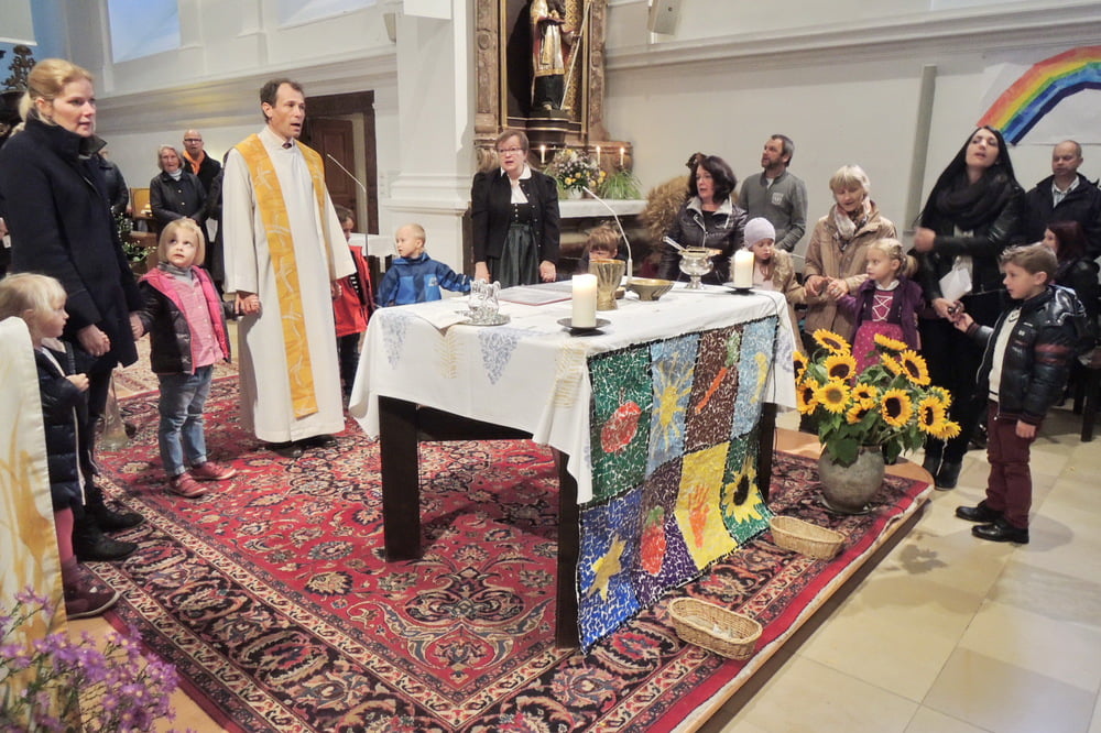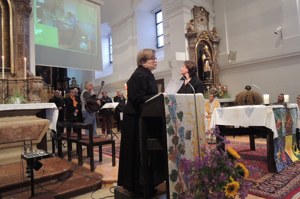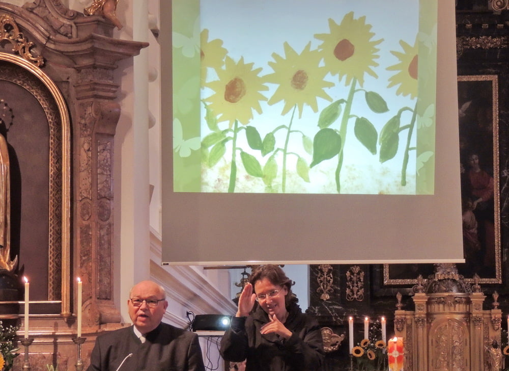 Der Familienchor unserer Pfarre sang die Zwischenstrophen und so lobten und dankten wir alle Gott aus ganzem Herzen. Auch das Lied von der Sonnenblume, die den Kopf zur Sonne dreht, untermalten wir mit Gesten. Zum Schluss sangen wir "Hinaus in die Welt". Wir wollten von Gottes Taten sprechen, den Frieden zu den Menschen bringen, von der Liebe singen und Freude bringen.