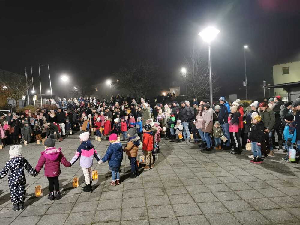 Am Abend folgte dann das Highlight: unser Laternenumzug. Gemeinsam mit den Familien trafen wir uns an der Kirche und zogen, begleitet von leuchtenden Laternen und fröhlichem Gesang, bis zum Vorplatz der Mittelschule. Dort spielten die Schulanfänger die Martinslegende nach und tanzten einen Laternentanz.