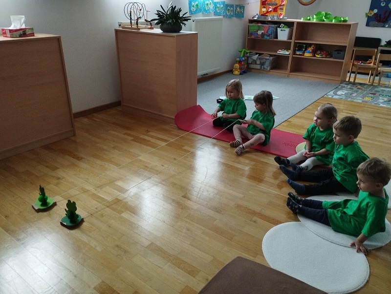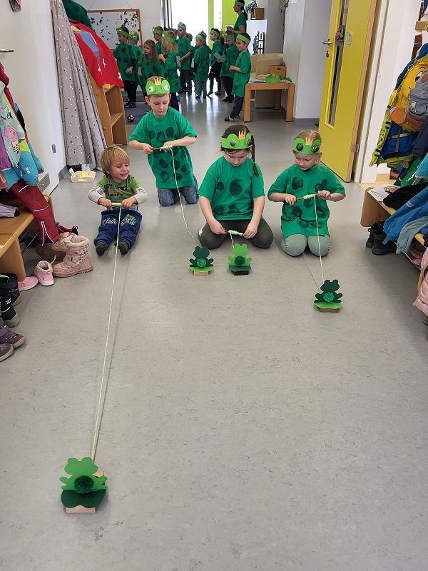 Gut gestärkt nach einer leckeren Jause, trafen sich alle Frösche im Bewegungsraum. Es wurden gemeinsam Lieder gesungen. Anschließend gab es für die Frösche verschiedene Aufgaben wie Fliegen fangen, Froschzielwurf, Froschwettrennen, Frösche füttern und noch vieles mehr.