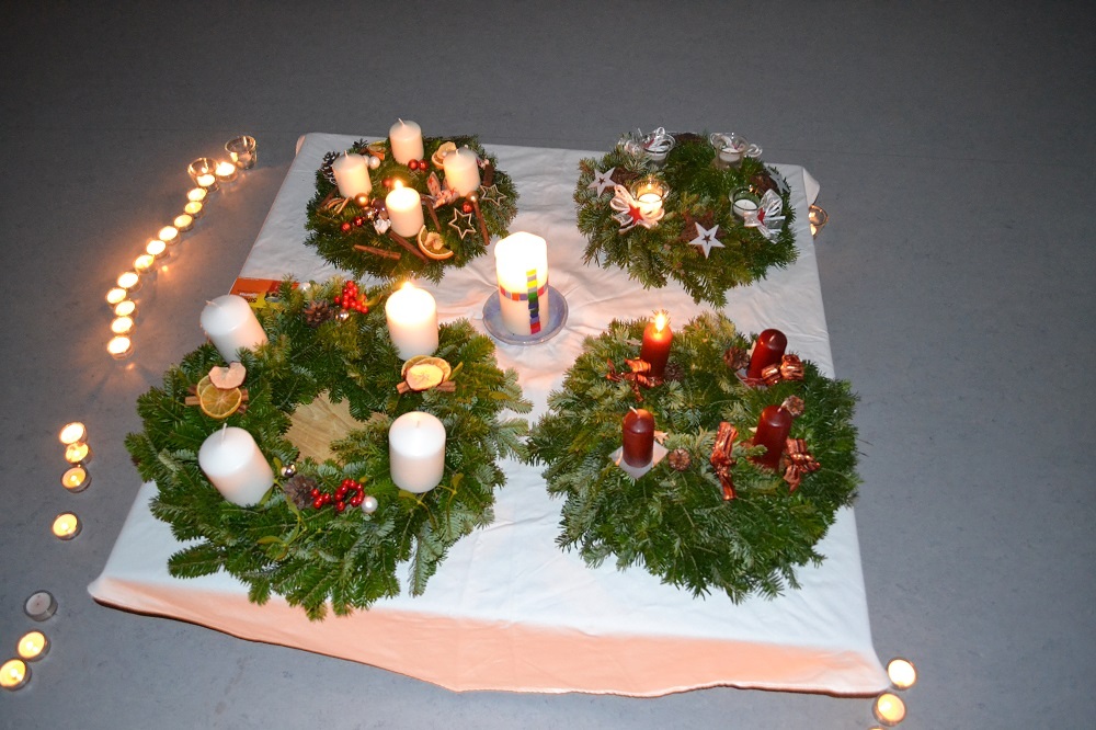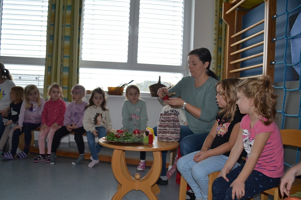Der Advent wird im Kindergarten bewusst gefeiert. Kindergartenkinder und die Kinder aus der Krabbelstube trafen sich im Bewegungsraum. Mit Liedern, adventlichen Zeichen und Texten feierten wir den Adventbeginn. Pfarrassistent Josef Rathmaier nahm die Segnung der Adventkränze aller Gruppen vor.