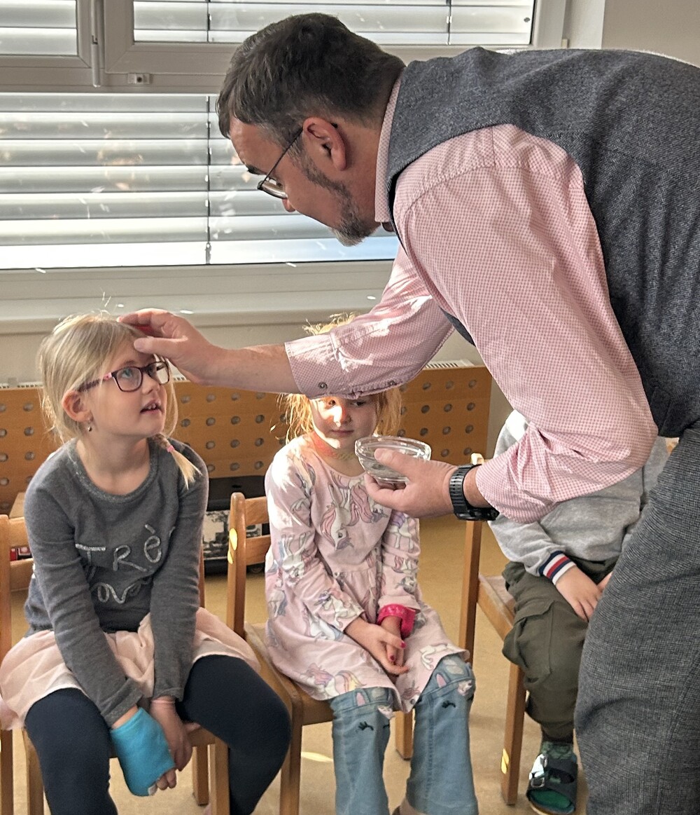 An diesem Tag besuchte uns Helmut Außerwöger, um den Kindern das Aschenkreuz zu geben. Dabei erfuhren sie die Bedeutung dieses Brauches und redeten über die bevorstehende Zeit.