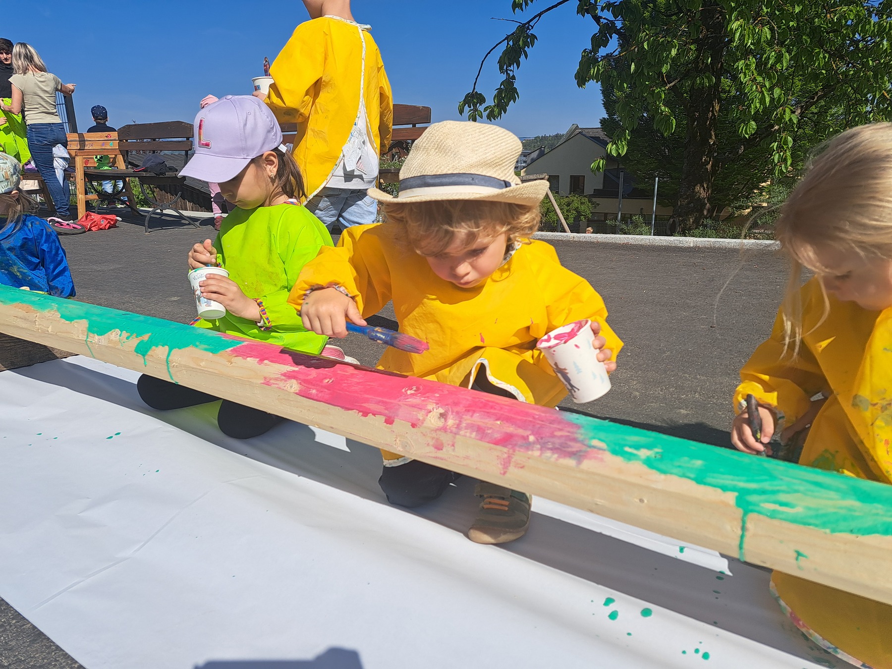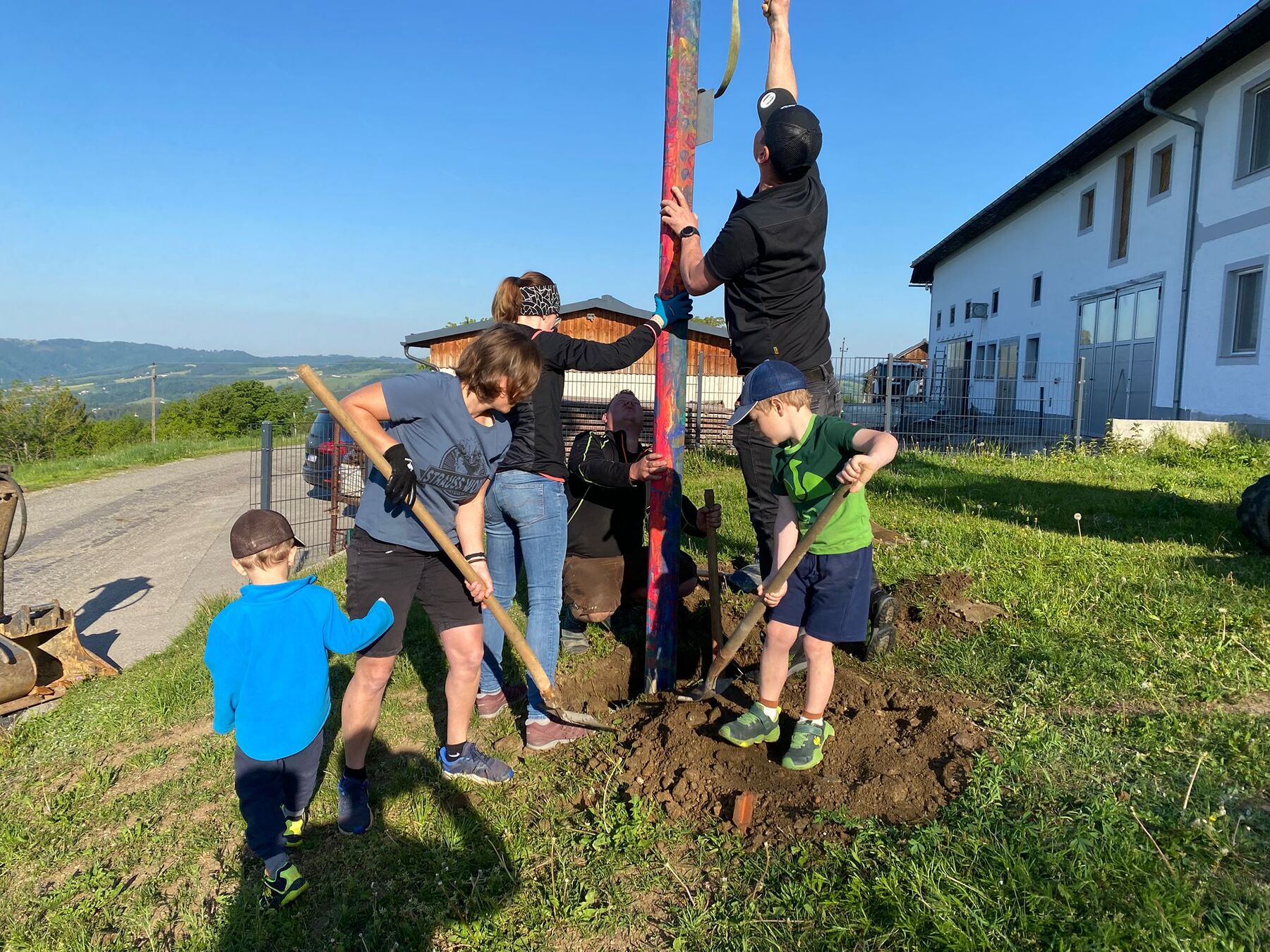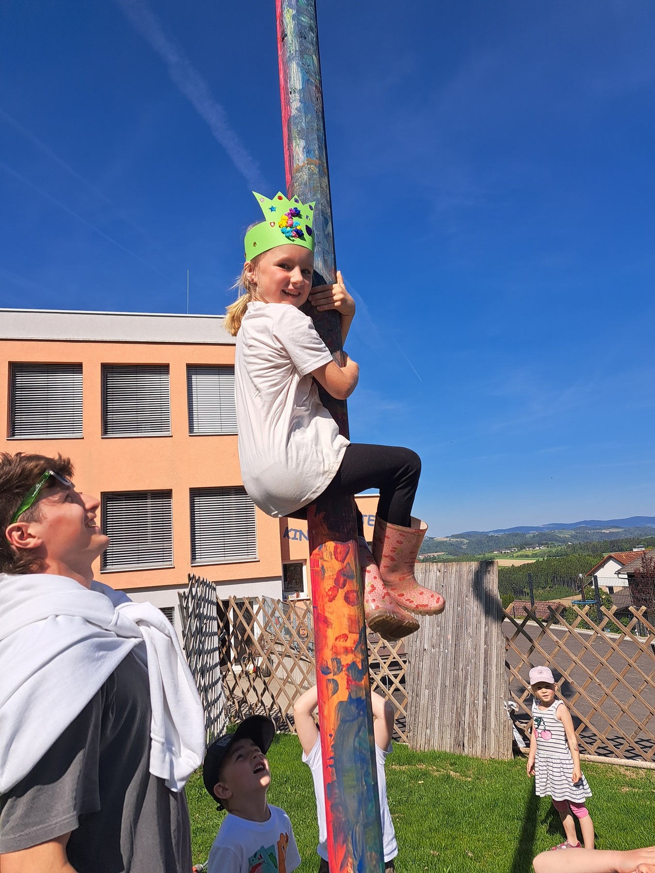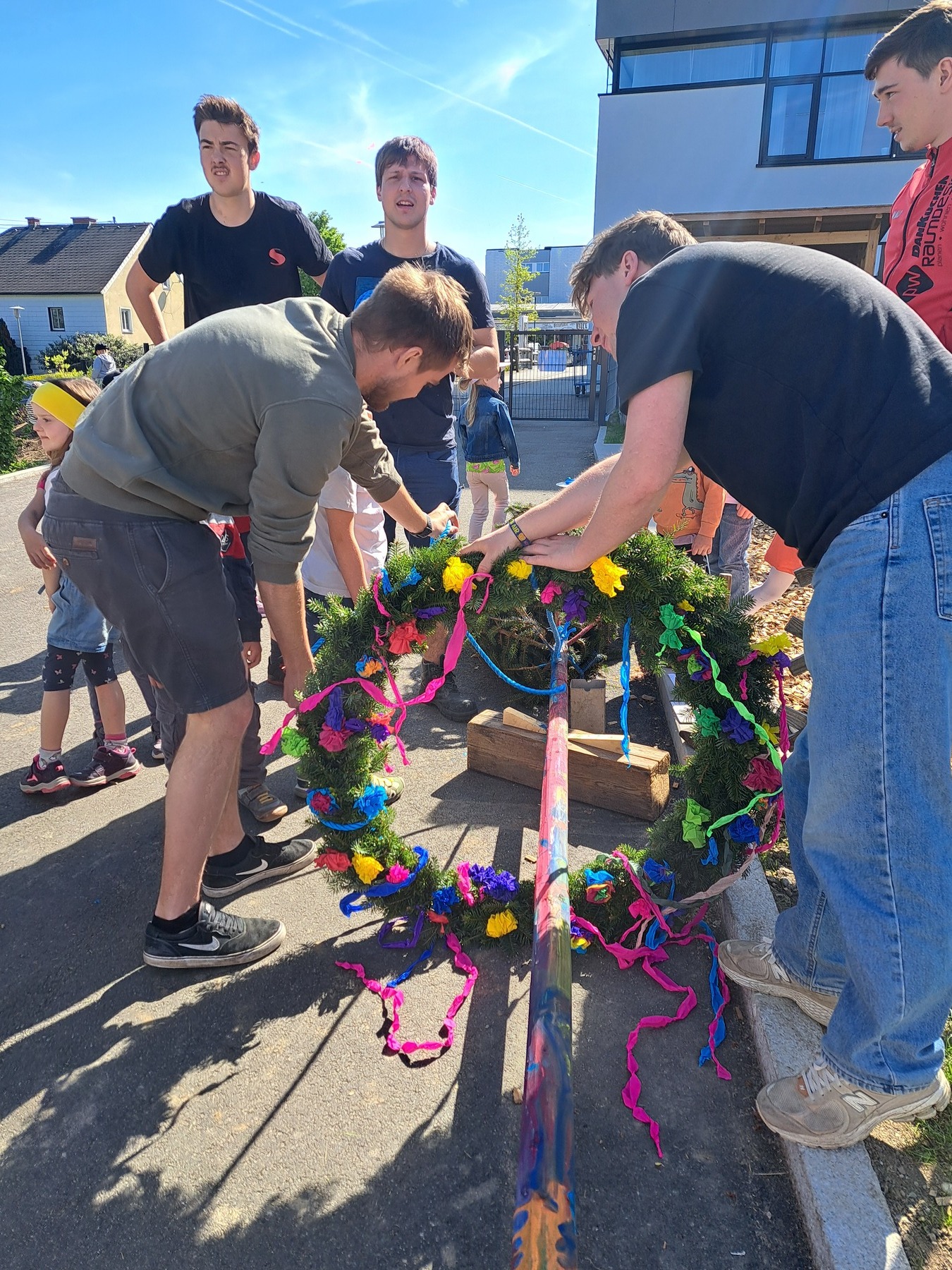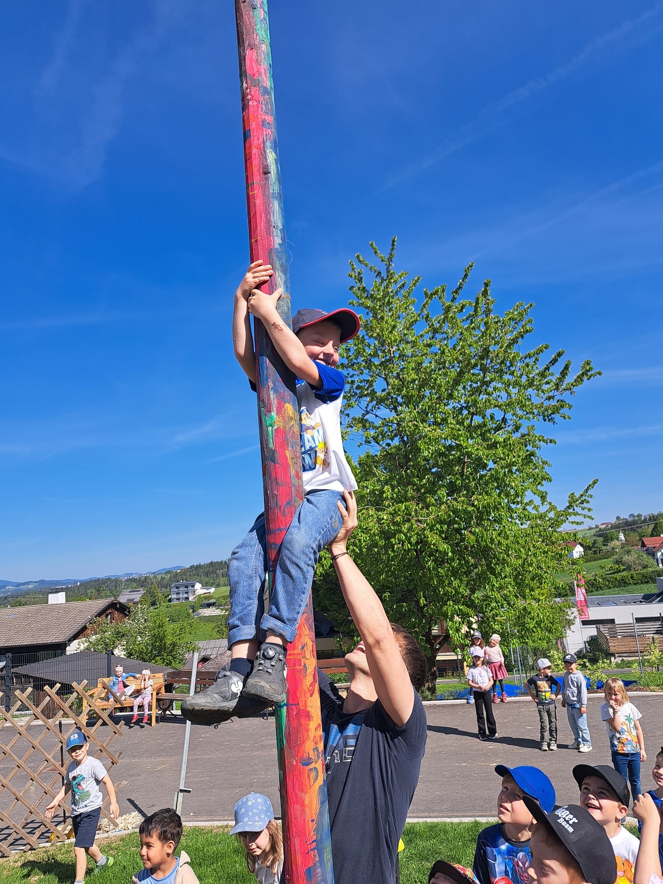 Gemeinsam mit der Landjugend bemalten und schmückten die Kinder voller Eifer den Baum, um ihn persönlicher und bunter zu gestalten. Nach dem Aufstellen durften die Kinder ihre Kletterkünste ausprobieren – ein Spaß für Groß und Klein.