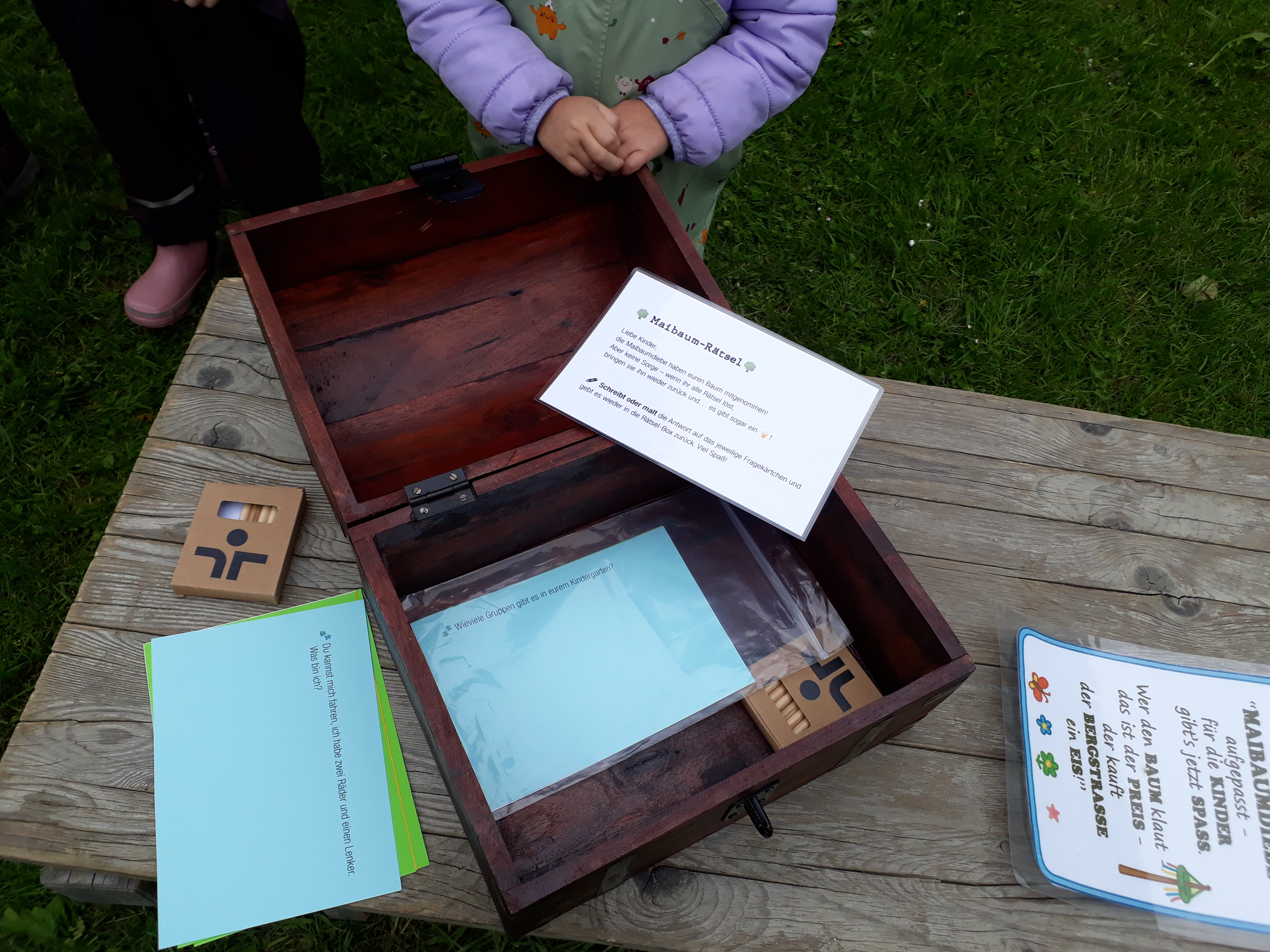 Anstatt des Maibaums fanden wir eine Schatztruhe mit Rätselaufgaben. Welch eine Überraschung - welch eine Aufregung!