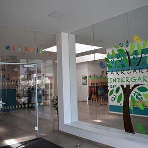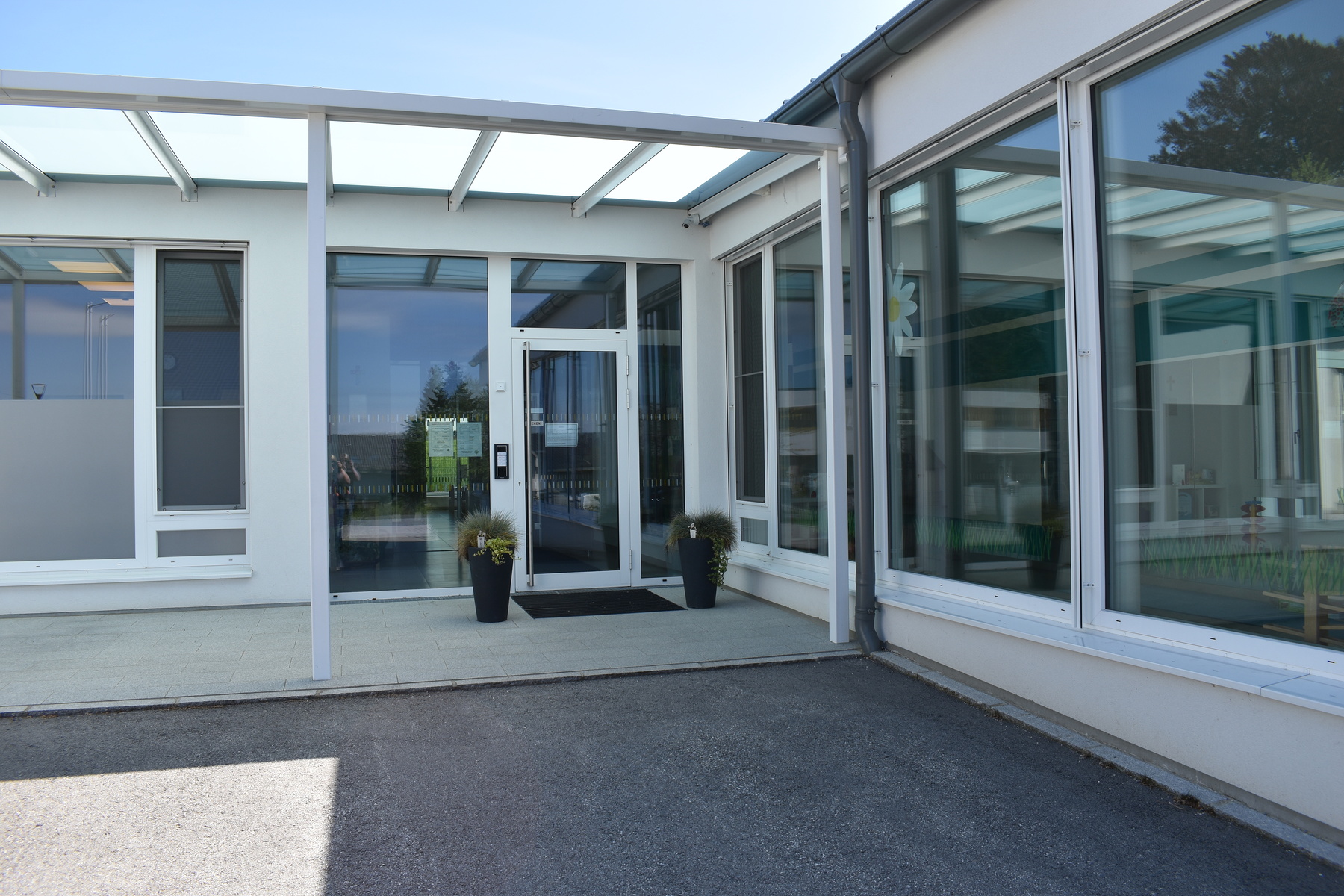 Auf der rechten Seite des Gebäudes sind 5 Kindergartengruppen untergebracht, auf der linken Seite 3 Krabbelstubengruppen. Im Mittelteil befinden sich die gemeinsam genutzten Räumlichkeiten wie der Turnsaal, das Büro oder der Personalraum.