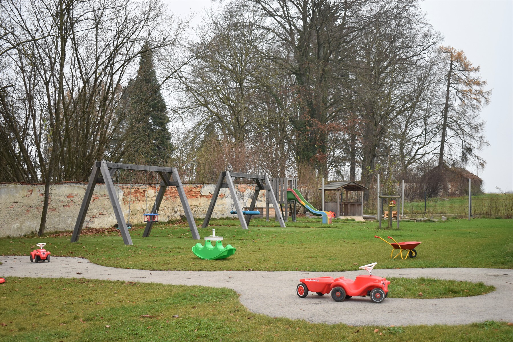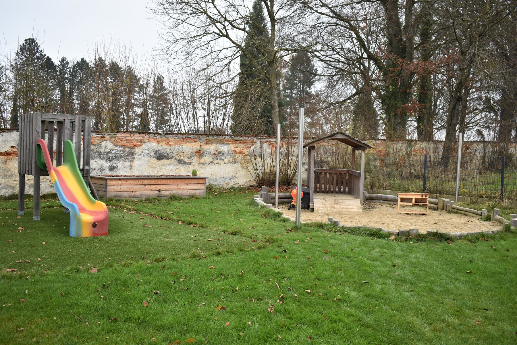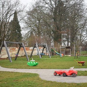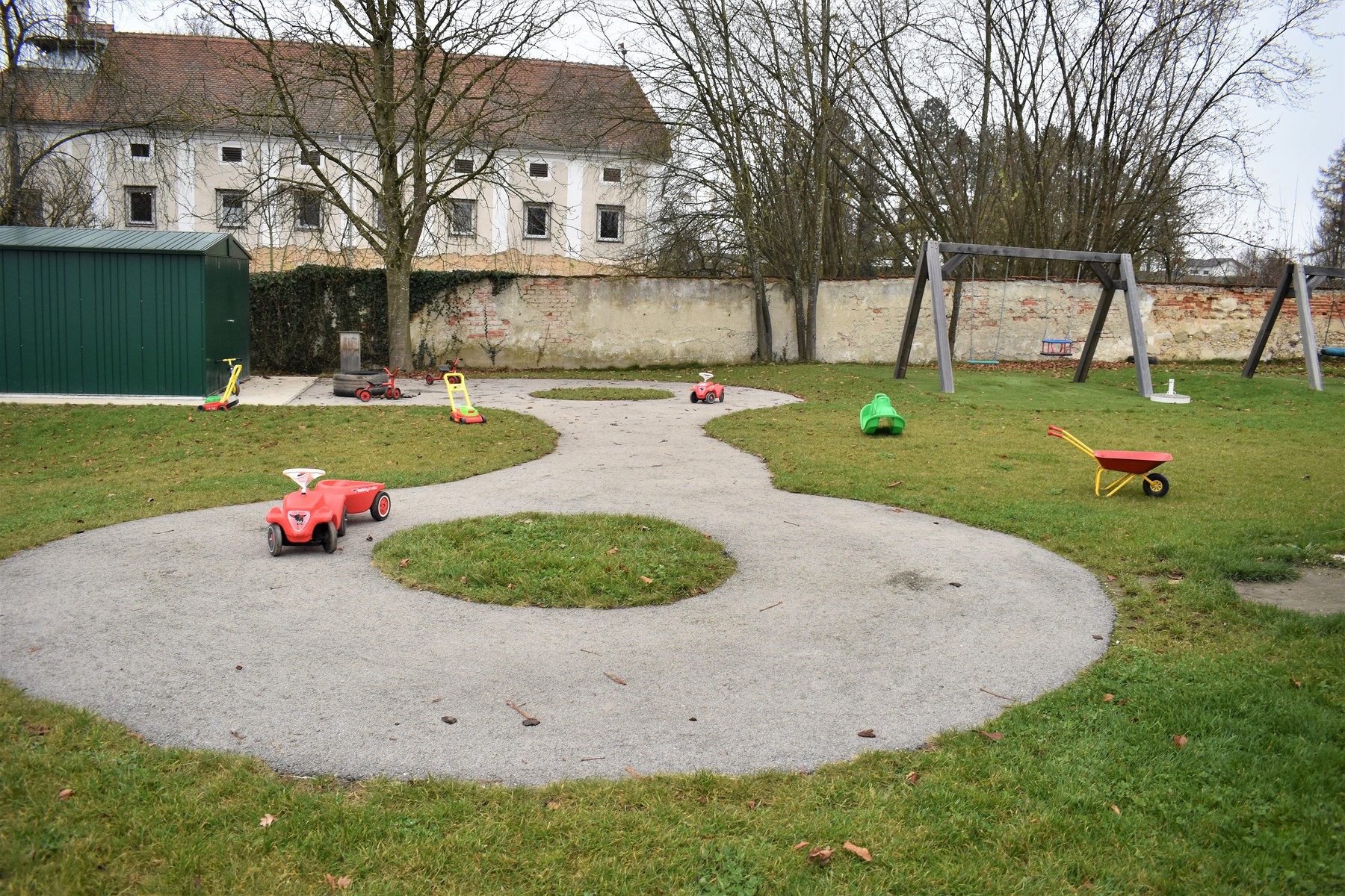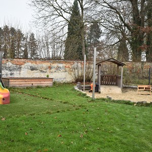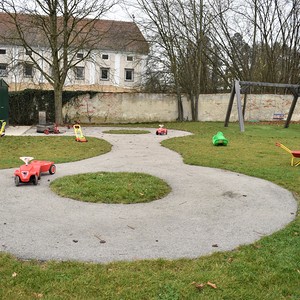 Der Garten ist mit den verschiedensten Spielgeräten ausgestattet, die den motorischen Bedürfnissen der Kinder gerecht werden. Hier findet man neben einer Fahrstraße mit Fahrzeugen auch Schaukeln, eine Rutsche, einen Balancierbalken, ein Holz-Tipi, ein Kletternetz, einen großen Sandkasten mit Spielhaus und Sonnensegel und diverse Spielamterialien wie Bälle, Straßenmalkreisen, Scheibtruhen, Besen, etc. welche die Kinder zum Spielen und Toben einladen.