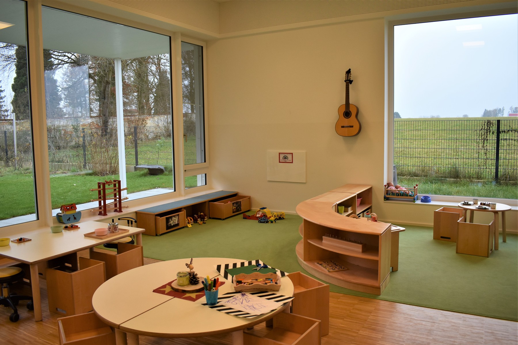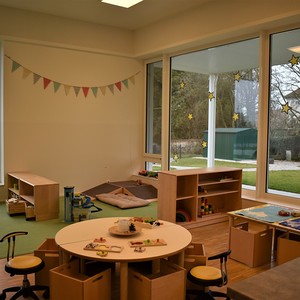 Die Gruppenräume sind mit den gleichen Möbeln ausgestattet. Das Spielmaterial wird anhand den Interessen der Kinder ausgewählt und von der Pädagogin ausgetauscht, sodass Bildungsprozesse stattfinden können.