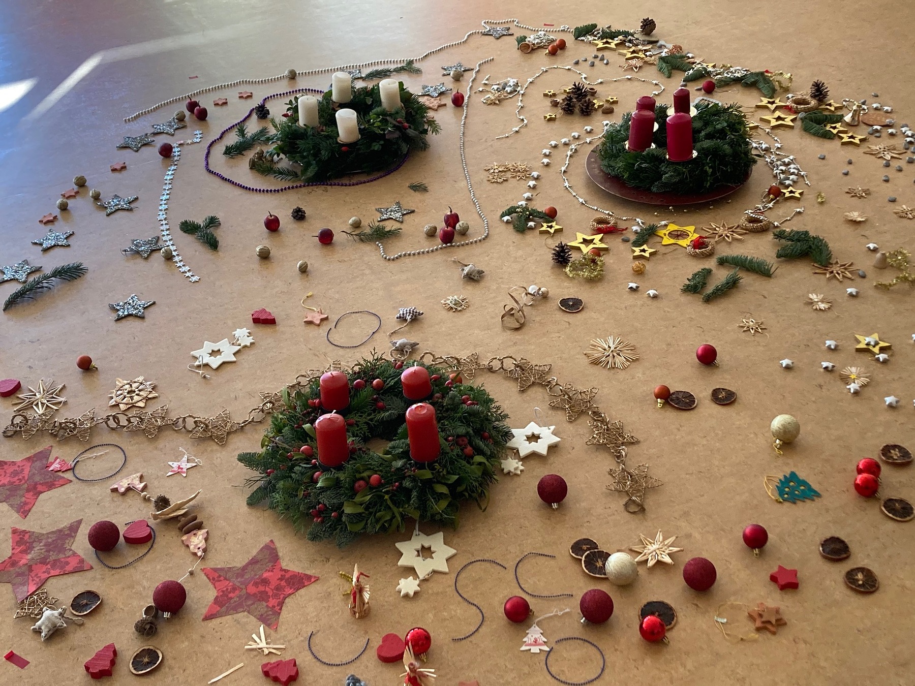 Wir banden den Adventkranz, während die Kinder mit den Zweigen experimentierten und mithalfen! Im Turnsaal legten alle drei Gruppen hintereinander einen Teil des großen Adventmandalas. Jede Gruppe für sich leitete damit stimmungsvoll den Advent ein!