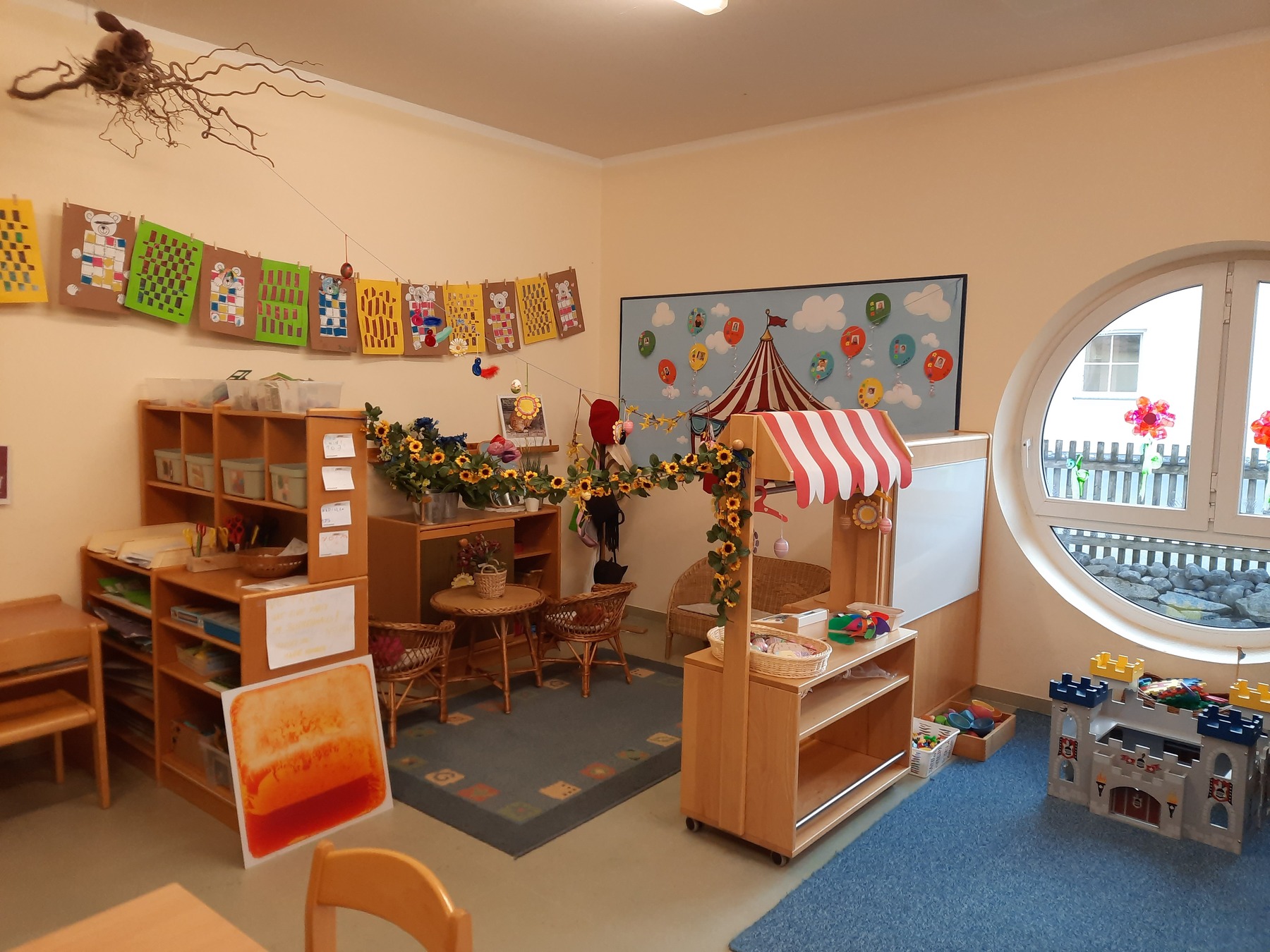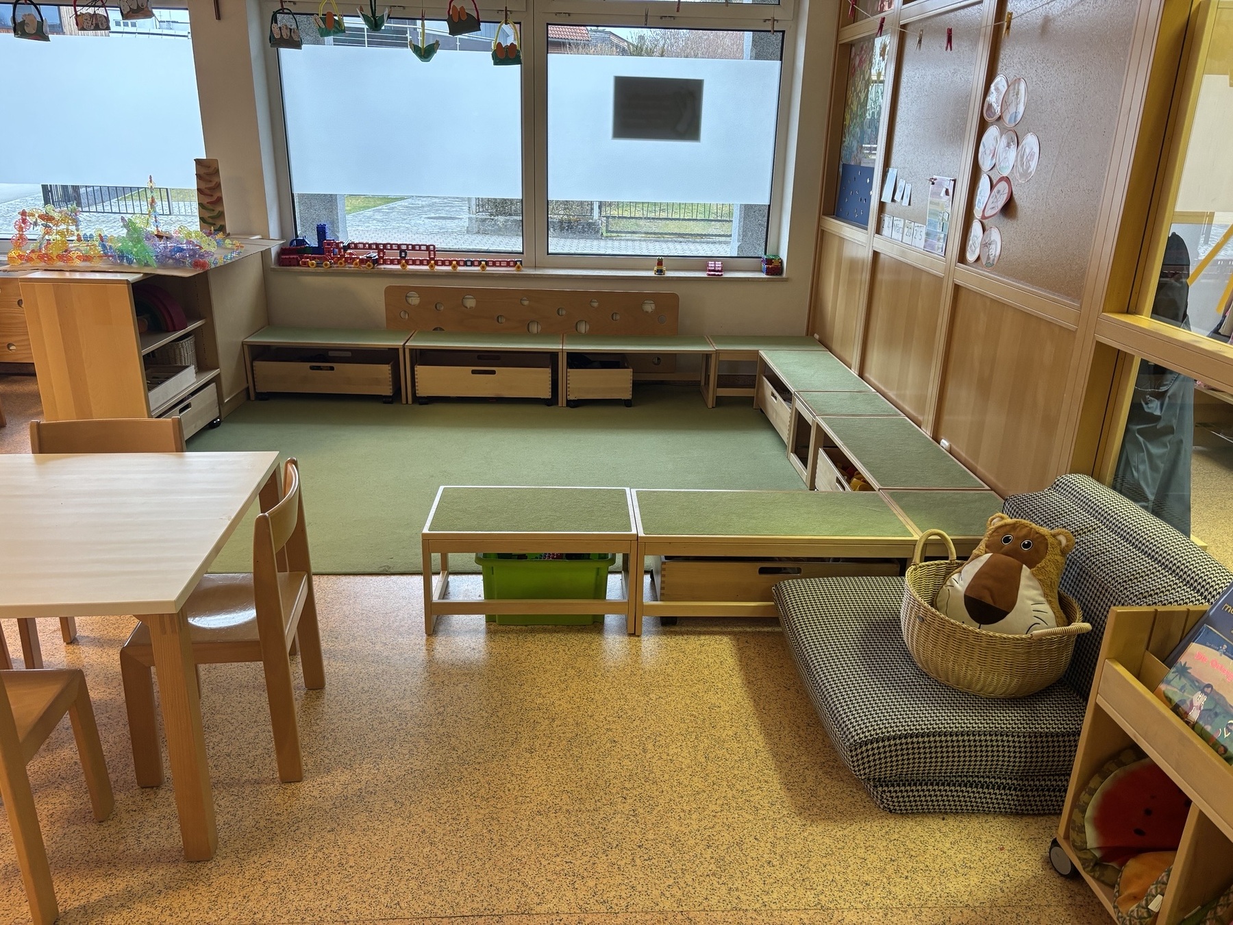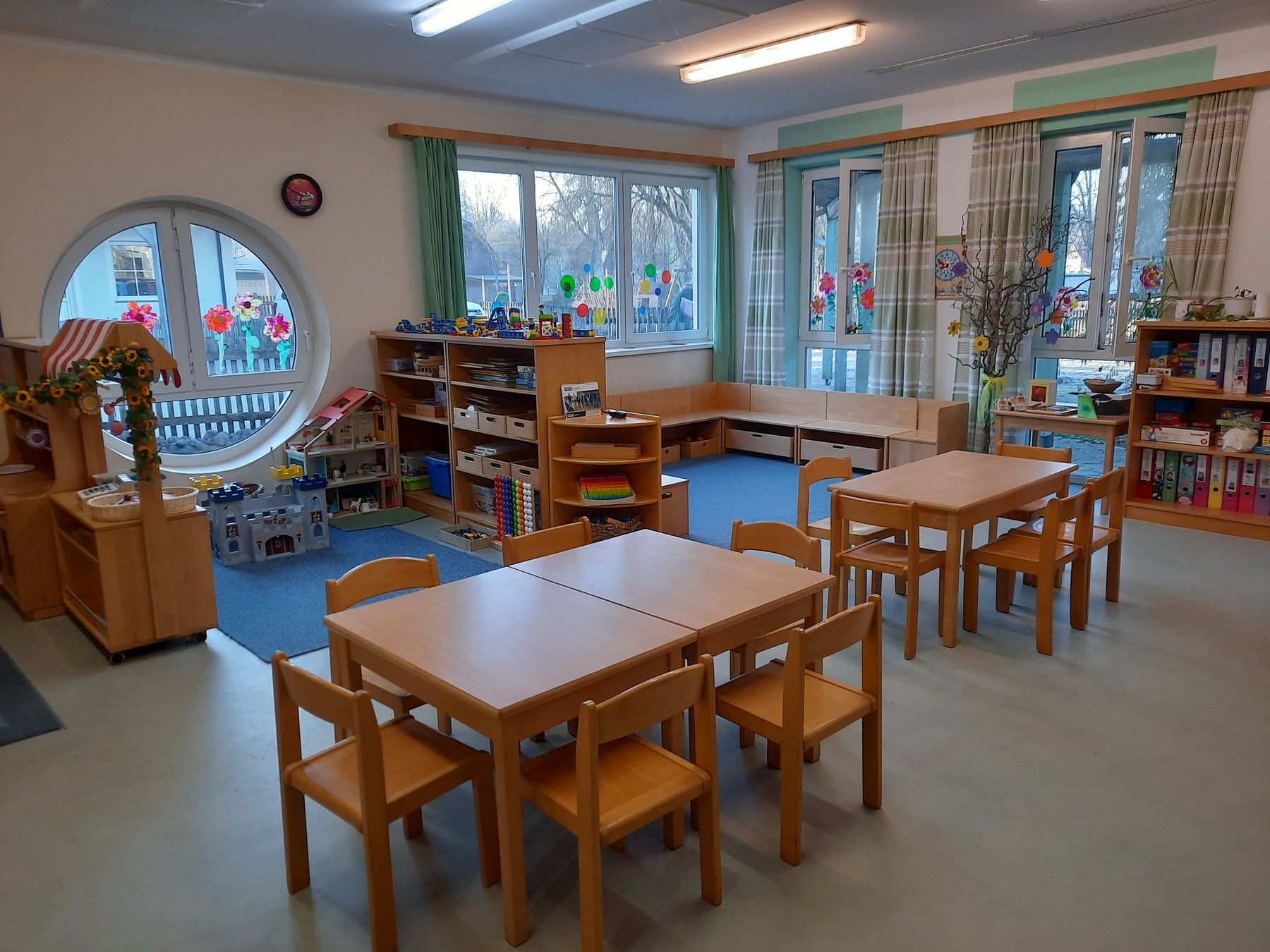 - Gruppenräume: Diese Räume sind das Herzstück unseres Kindergartens. Hier spielen, lernen und entdecken die Kinder gemeinsam. Er bietet Bereiche für die Begegnung aber auch Orte für den Rückzug. Die einzelnen Spielbereiche werden nach Interessen oder Wünsche