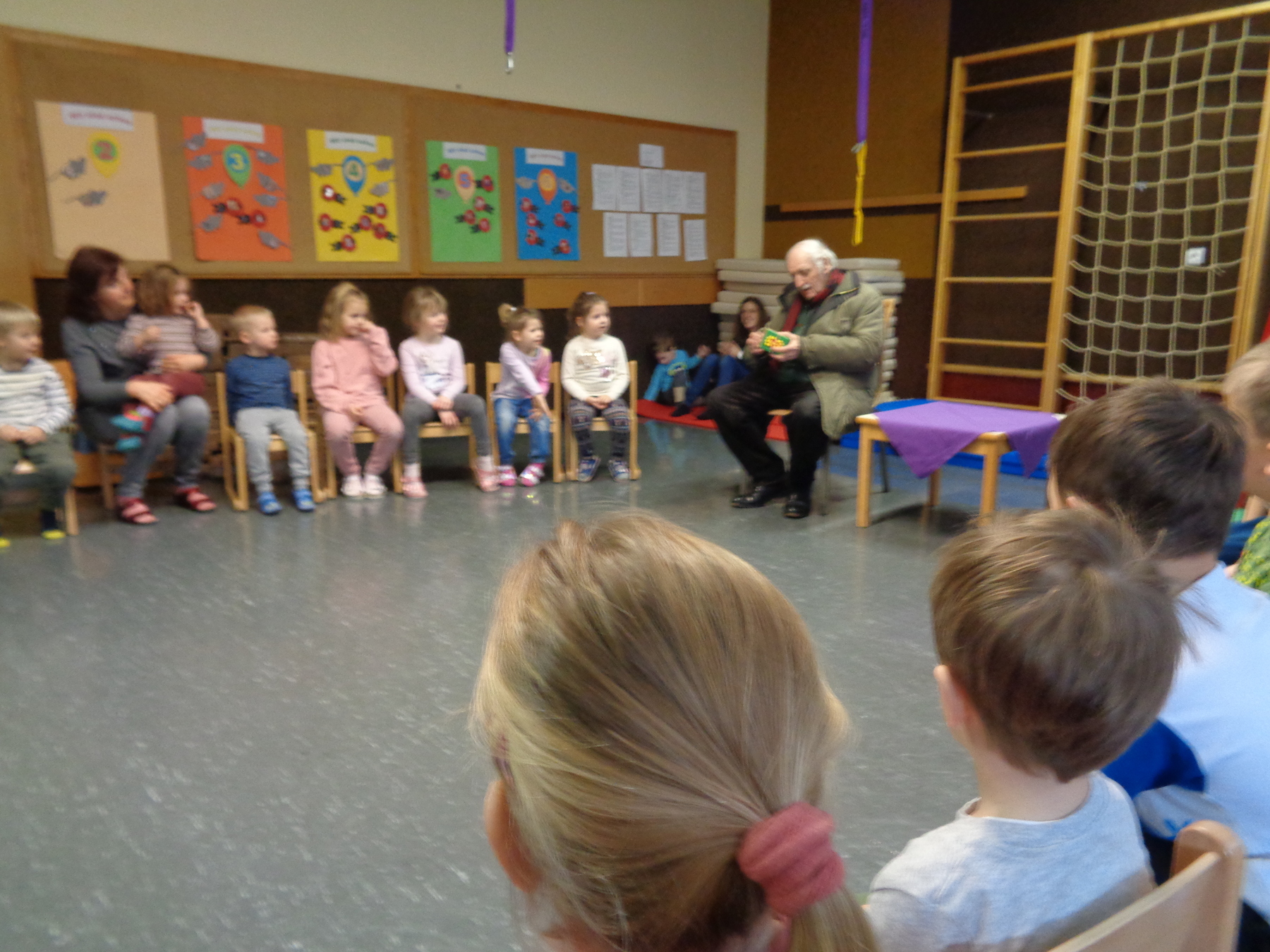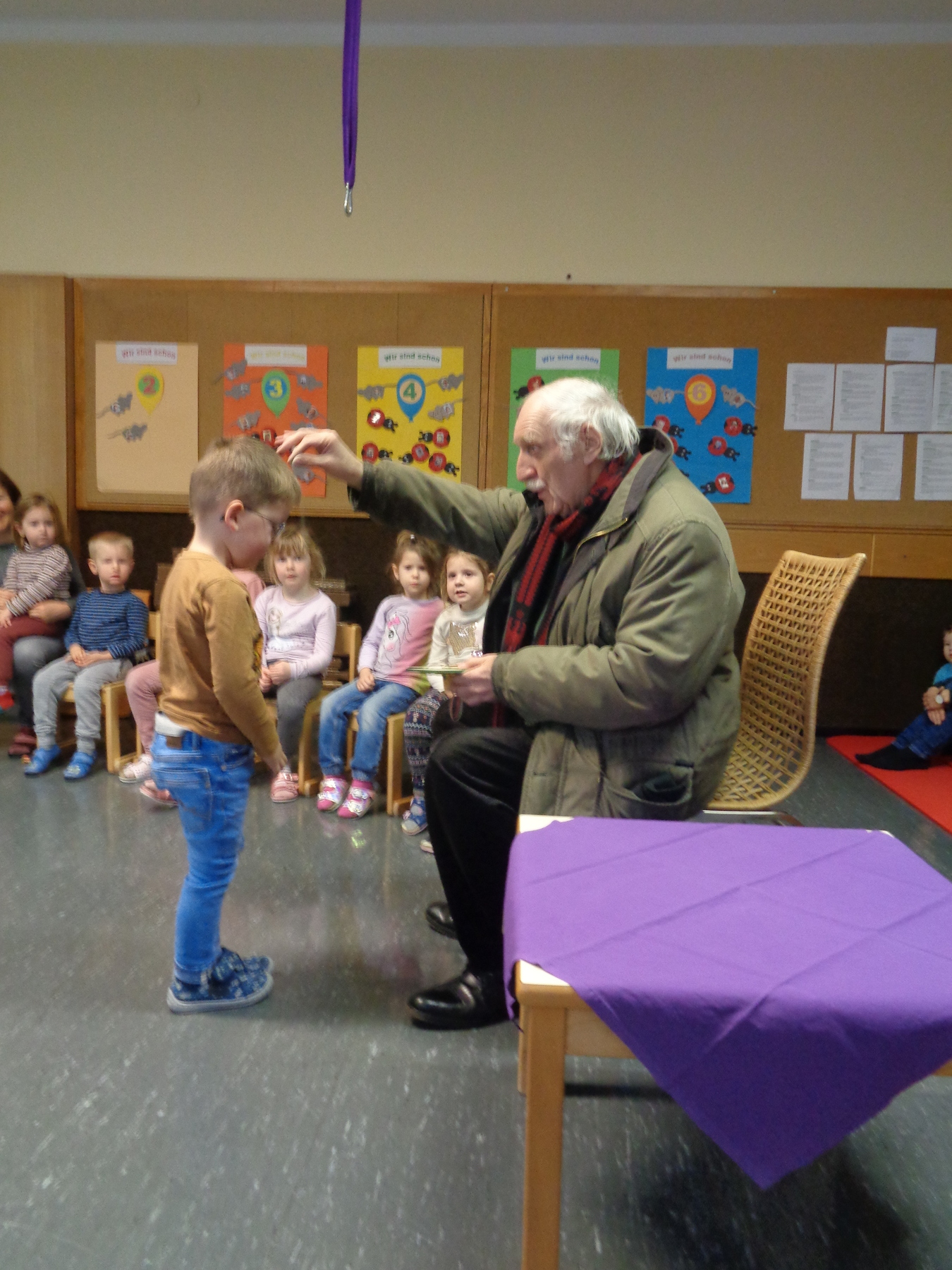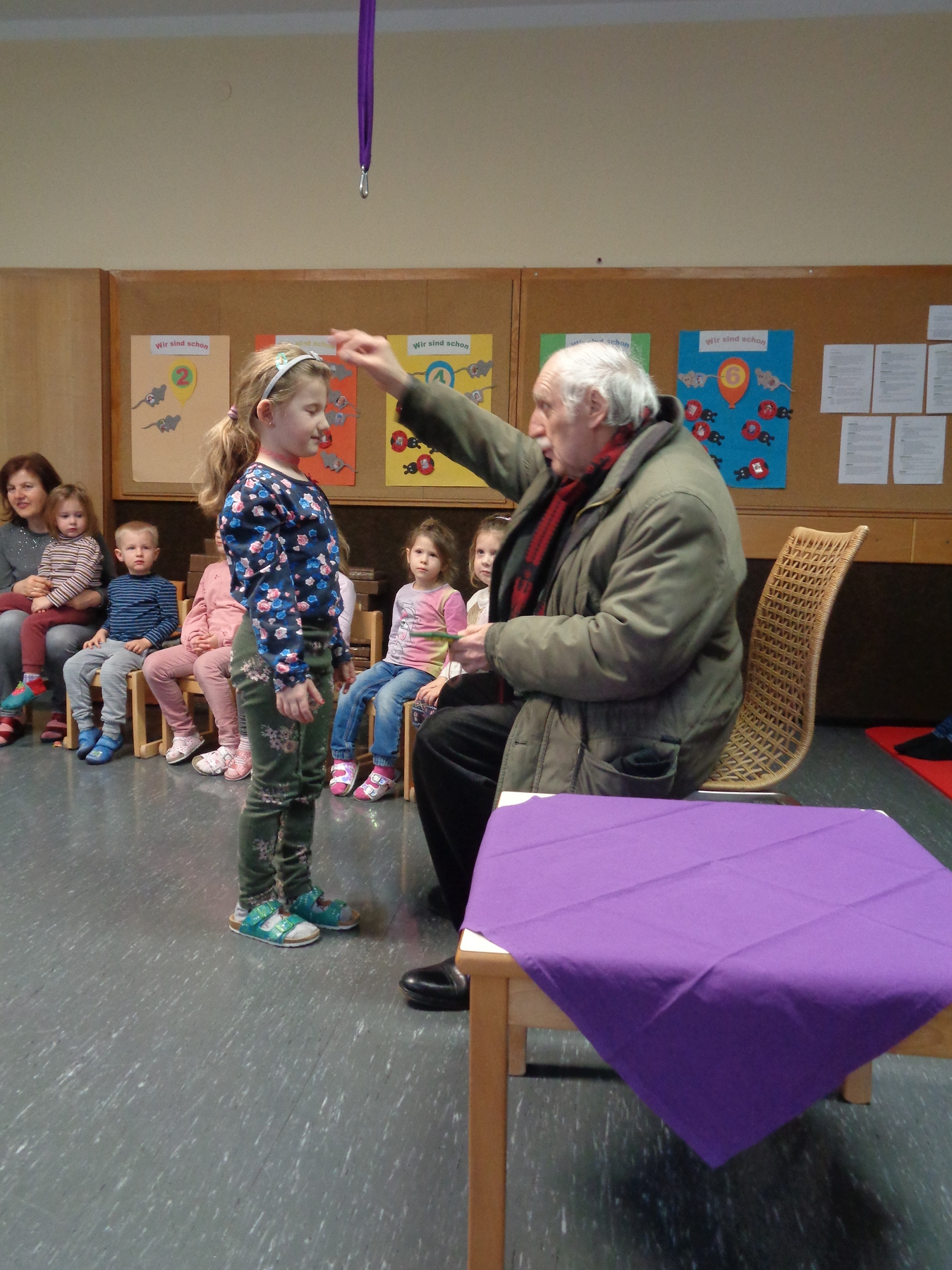 Auch der Herr Pfarrer kam uns im Kindergarten besuchen und spendet den Kindern das Aschenkreuz.