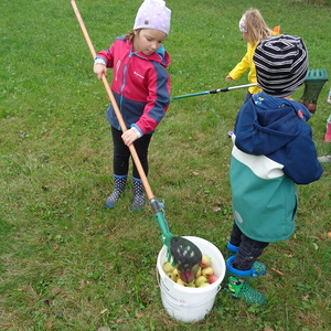 Danach ging es zur Apfelernte. Wir sammelten Äpfel vom Boden aber auch das Pflücken war den Schulanfängern lustig.
