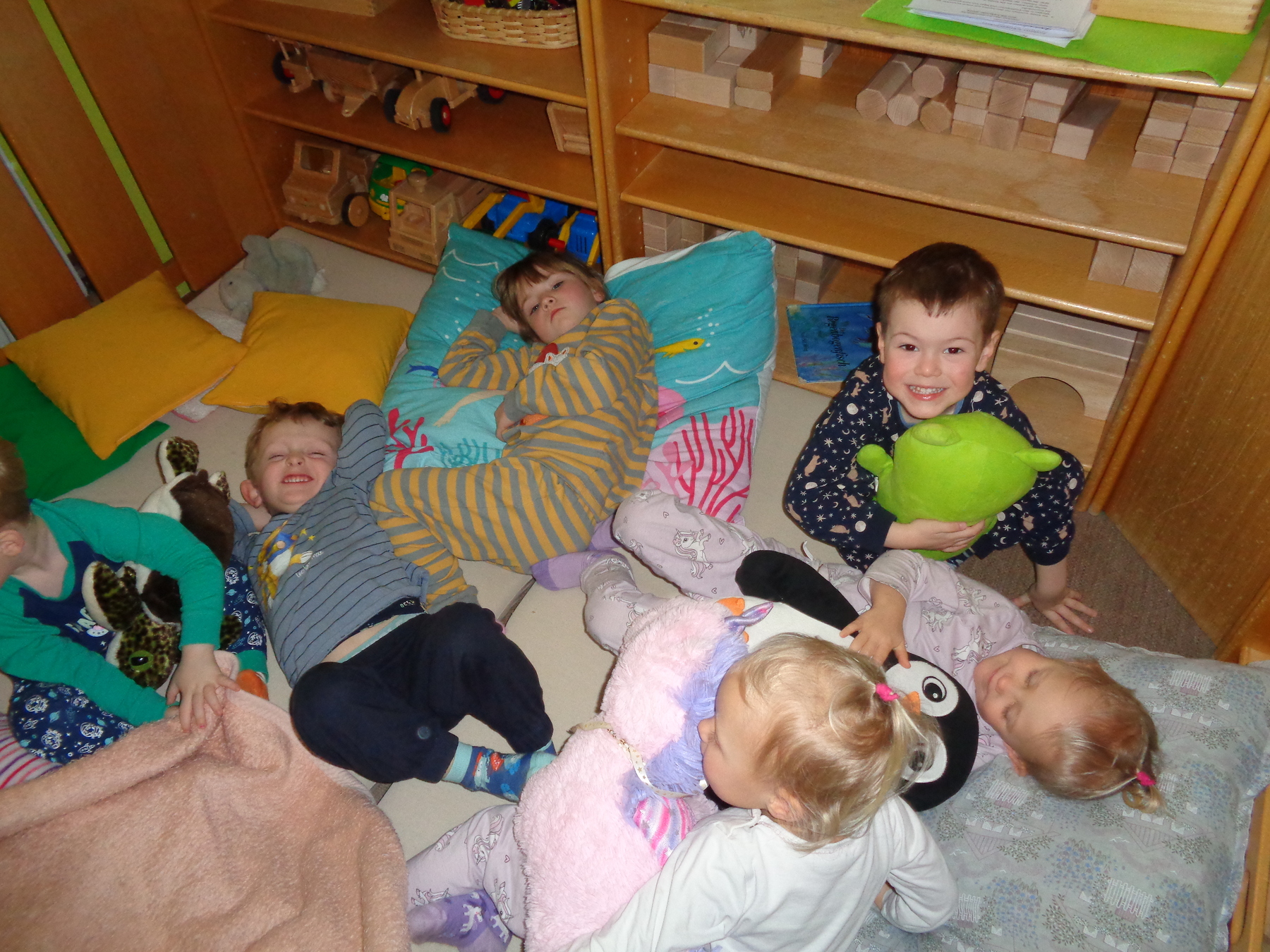 Auch die traditionelle Pyjamaparty durfte nicht fehlen. Wir kamen mit unseren Pyjamas in den Kindergarten. In unserer großen Kuschelecke machten wir uns es gemütlich und warteten, bis uns der Wecker aufweckte. Mit Morgengymnastik starteten wir in den Tag und zum Frühstück gab es leckeren Kakao und Semmeln.