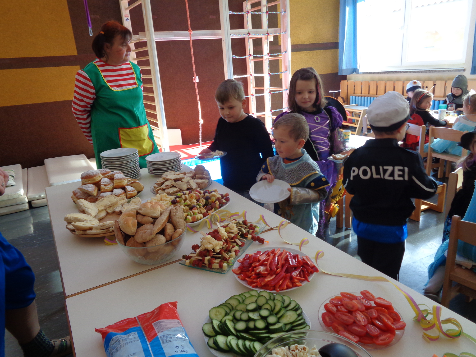 Am Faschingsdienstag durfte jedes Kind verkleidet in den Kindergarten kommen. Lustige Spiele wurden angeboten und beim gemeinsamen Faschingsbuffet mit selbstgebackenen Brötchen, verschiedenen Spießen und natürlich Faschingskrapfen konnten wir uns stärken.
