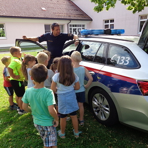 Die Kinder waren ganz neugierig welche Gegenstände sich im Auto der Polizei befinden.