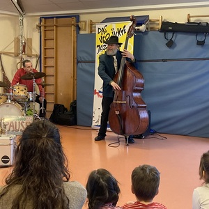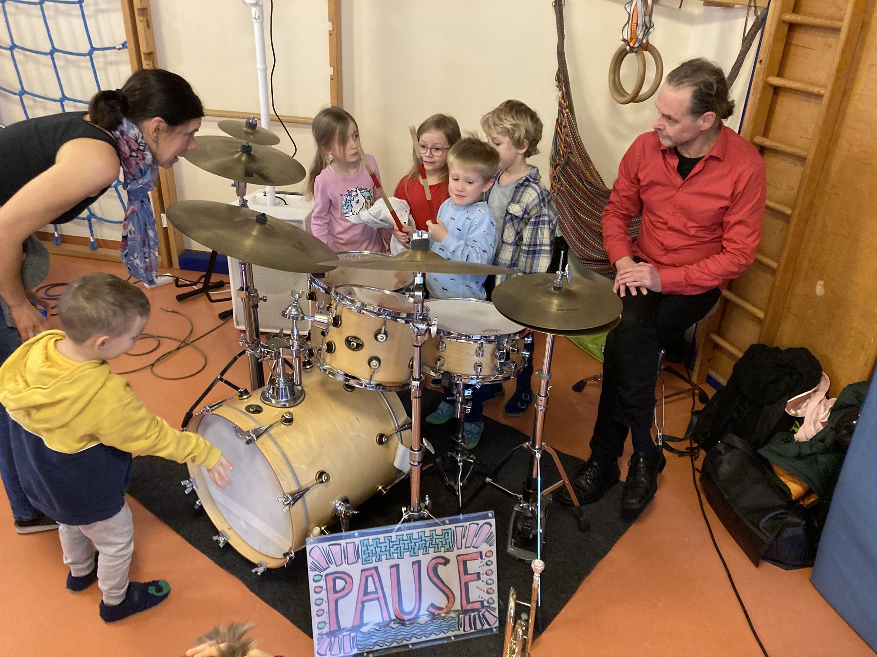 Saxophon, E-Gitarre, Trompete, Schlagzeug, Klavier und Kontrabass dürfen nach dem Konzert von den Kindern aus der Nähe betrachtet und ausprobiert werden.