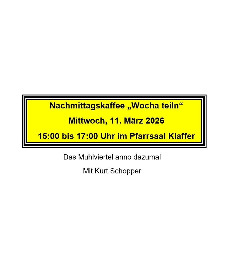 Am Mittwoch, 11. März lud der Sozialausschuss zum insgesamt 11. „Wocha teiln“ um 15 Uhr wieder in den Pfarrsaal ein. Nach der kurzen Andacht von Pfarrer Jakob überraschte Kurt Schopper aus Aigen-Schlägl mit dem Kultur.Gut.Oberes Mühlviertel - Sammlung Lehner, welches im Stiftsmeierhof Schlägl untergebracht ist. Das Museum zeigt „das Mühlviertel anno dazumal!“ Es handelt sich überwiegend um Exponate aus dem Bezirk Rohrbach-Berg, die Zeugen des bäuerlich-handwerklich geprägten Lebens früherer Zeit sind. Ausgewählte Objekte zu den Themen Wasser, Stein, Holz, Eisen, Glas, Leder, Honig & Wachs, Stroh, Flachs, Wolle, Tierzucht und Pflanzenbau werden präsentiert.