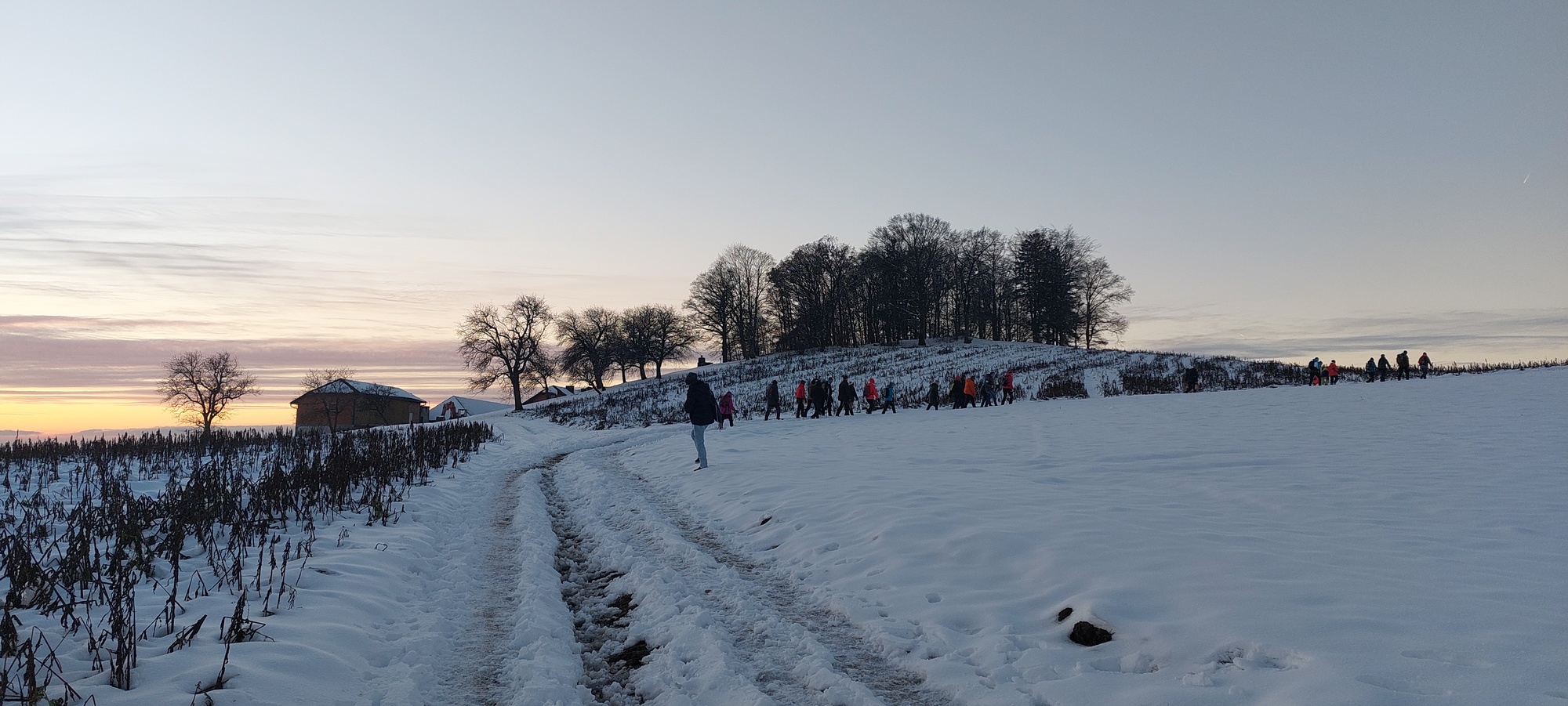 Ingesamt dreißig Teilnehmer*innen - Erwachsene und Kinder - machten sich auf den Weg zu einer adventlichen Wanderung mit Gedanken zu Mariens Gang zu ihrer "Base" (Tante) Elisabeth, orientiert an dem bekannten Adventlied "Maria durch ein Dornwald ging".