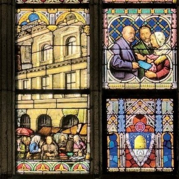 Im Hintergrund des Hauptbildes ist die Silhouette unserer schönen Landeshauptstadt zu erkennen und darüber schwebt die heilige Maria, ein Ebenbild der Marienstatue der Votivkapelle des Mariendoms. Die mittlere Ebene des Fensters personifiziert Linz als Stadt der Kaiser und der Wissenschaft. Demnach sind gleich drei Kaiser, die einen Bezug zu unserer Landeshauptstadt vorweisen, porträtiert. Rechts neben Kaiser Friedrich III., Kaiser Maximilian I. sowie der Hochzeit von Kaiser Ferdinand I. mit Anna von Ungarn ist der Astronom Johannes Kepler abgebildet. Seinen Blick gen Himmel gerichtet hält er in der einen Hand sein Fernrohr und die andere ruht auf einem Globus. Neben der christlichen, höfischen und wissenschaftlichen Bedeutung steht Linz ebenso für Kunst und Kultur, so erhalten die berühmten Komponisten Ludwig van Beethoven und Anton Bruckner im unteren Drittel eine gemeinsame Scheibe für ihr Abbild.