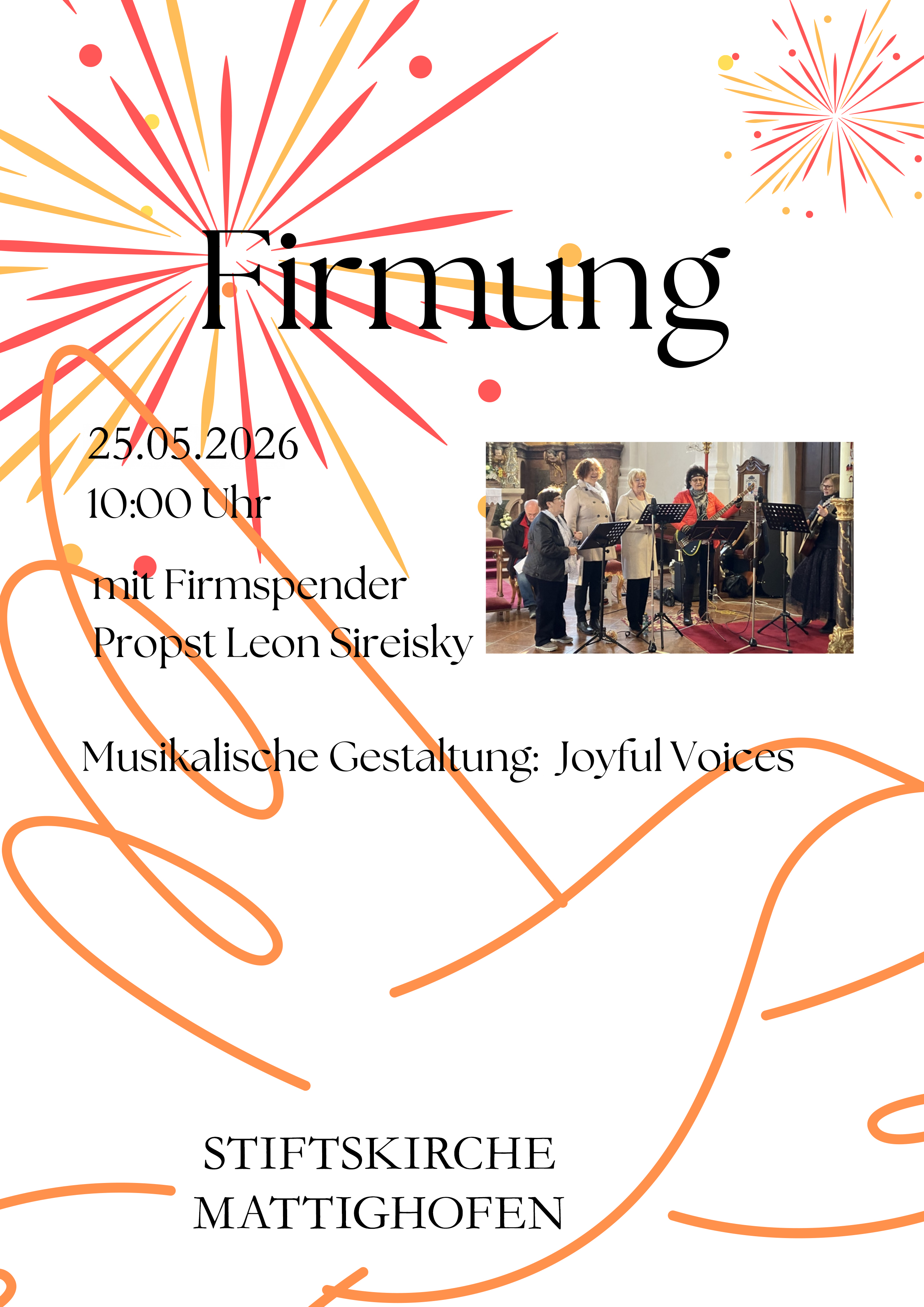 Aufstellung zur Firmung am Kirchenplatz, 25.5.2026, spätestens 9.3o h, gemeinsamer Einzug in die Kirche.