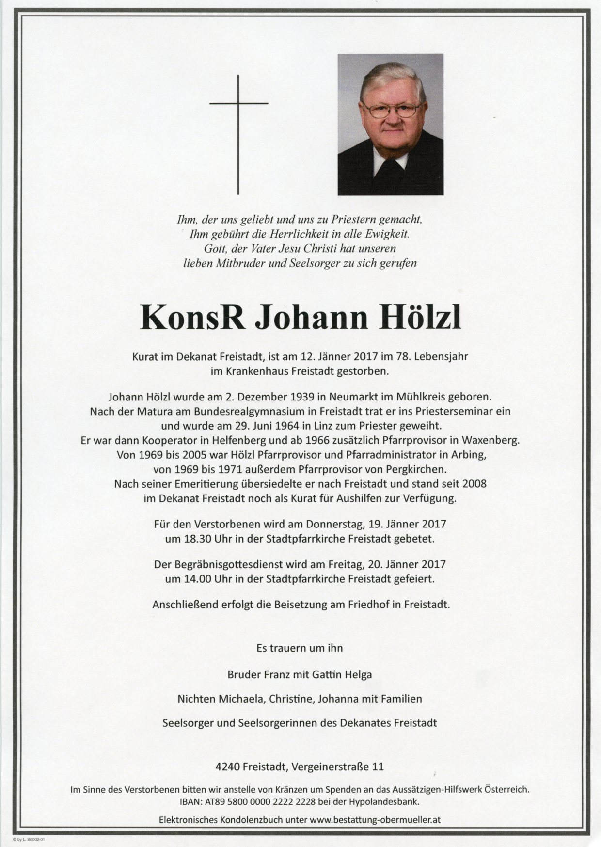 Für den Verstorbenen wird am Donnerstag, 19. Jänner 2017 um 18.30 Uhr in Stadtpfarrkirche Freistadt gebetet.