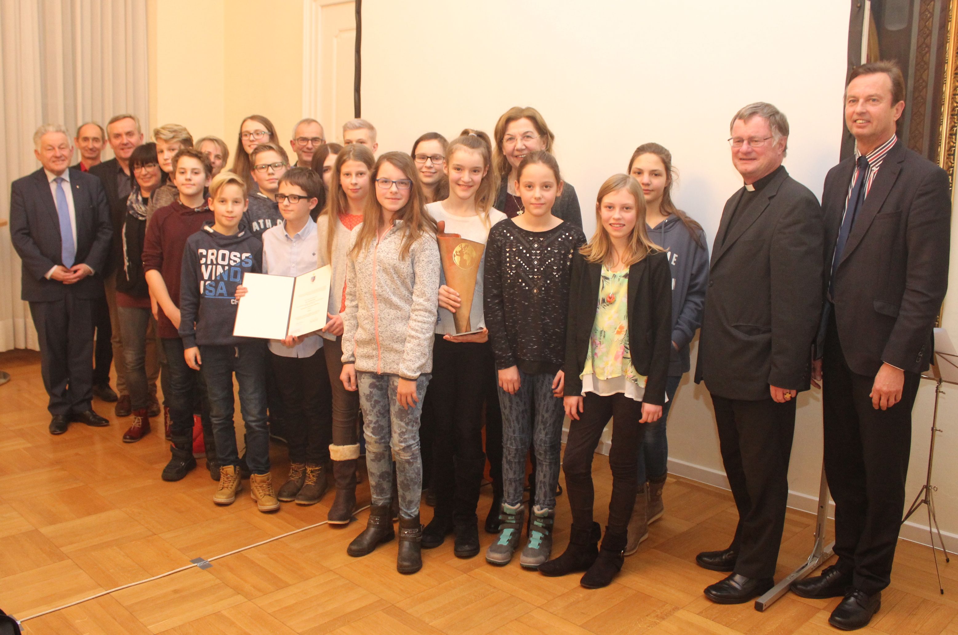Foto 4: VertreterInnen der NMS Sattledt mit Landeshauptmann Dr. Josef Pühringer, Bischof Dr. Manfred Scheuer und Missionsstellen-Leiter Mag. Andreas Reumayr.