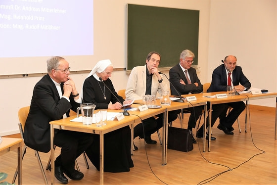 Podiumsdiskussion (v. l.): Prälat Kons.-Rat KR Mag. Martin Felhofer, Konventoberin Sr. Sigharda Leitner, Mag. Rudolf Mitlöhner (Moderation), Gen.-Dir. KommR Dr. Andreas Mitterlehner, Mag. Reinhold Prinz. © Cityfoto