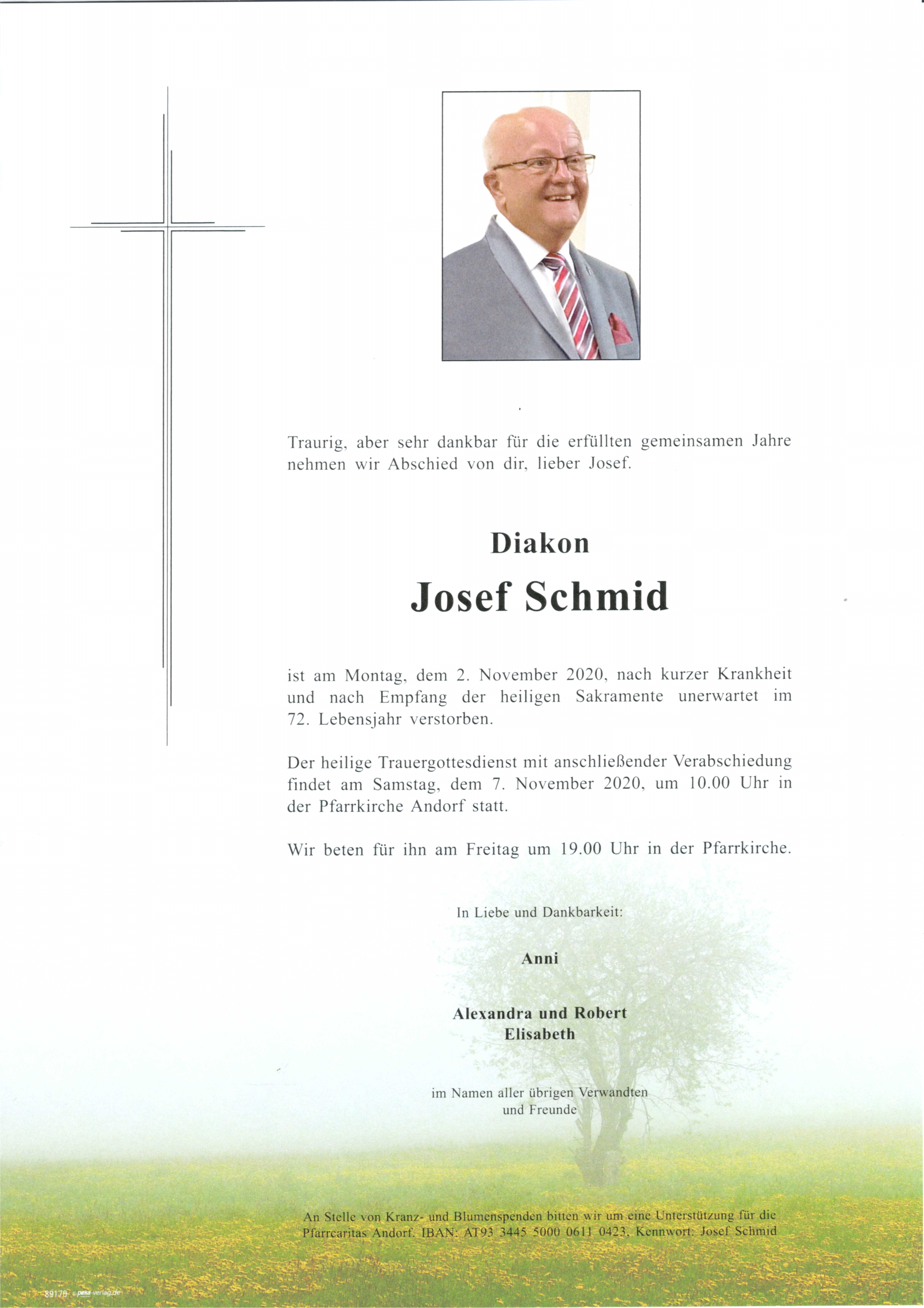 Am 22.6.2008 wurde er in Andorf zum Ständigen Diakon geweiht. Die eigene Erfahrung von Arbeitslosigkeit sowie der Tod seiner Ehefrau Maria im Jahr 2013 prägten in besonderer Weise sein diakonales Wirken. Er arbeitete ehrenamtlich in der Pfarre als Begräbnisleiter und Seelsorger im Altenheim Andorf mit und brachte sich in der Liturgie ein. Von 2013 bis 2016 kümmerte er sich zusätzlich um Menschen mit besonderen Bedürfnissen in Andorf. Josef Schmid hinterlässt seine Partnerin Anni und zwei erwachsene Kinder.