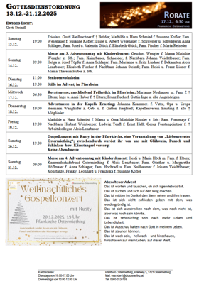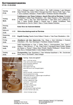 Auch Messintentionen für Verstorbene können an die oben genannte Handynummer geschickt werden. Wir bitten um Überweisung der Gebühr von € 13,- pro Intention auf das Pfarrkonto AT63 3437 0000 0161 5632. Herzlichen Dank!