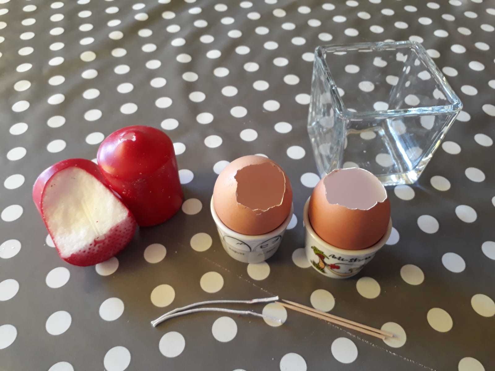 Den Docht mit einem Zahnstocher verknoten und im Ei platzieren.