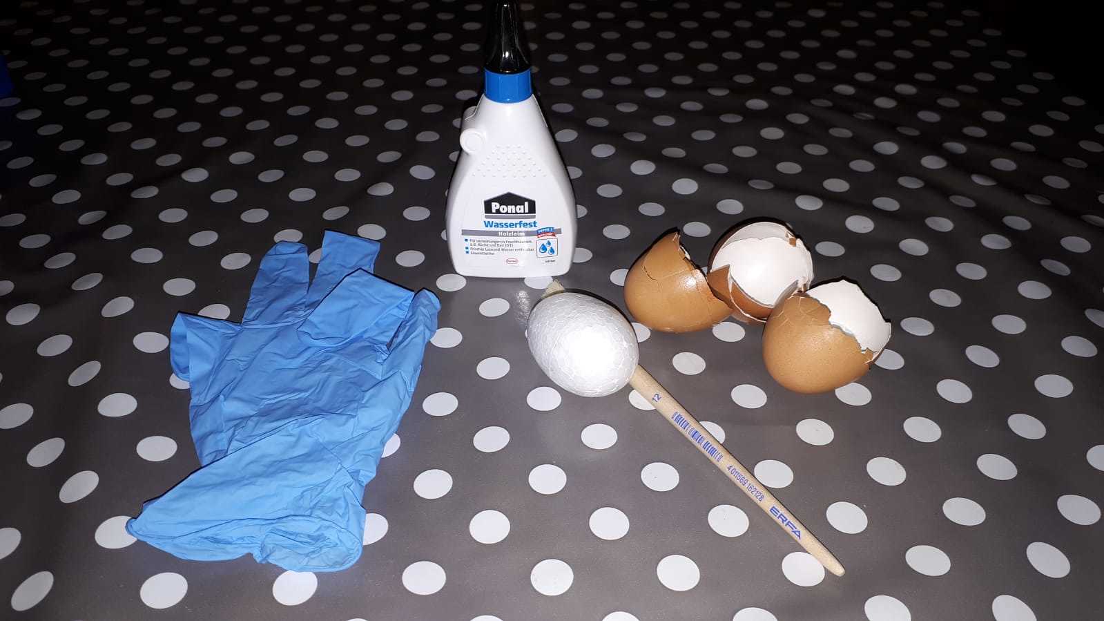 Schneiden Sie das Styroporei im unteren Drittel entzwei, spießen Sie die einzelnen Teile auf einen Zahnstocher und bepinseln Sie das Ei mit Leim.
