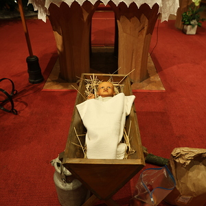In der heurigen Kindererwartungsfeier legt jede/r Mitfeiernde/r einen Strohhalm in die Krippe, sodass am Ende das von Bruno Lipp wunderbar geschnitzte Jesuskind gut gebettet liegen kann. Gott ist Mensch geworden!