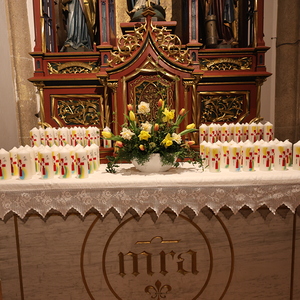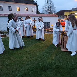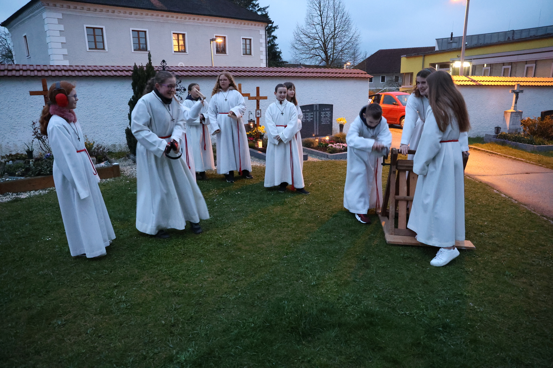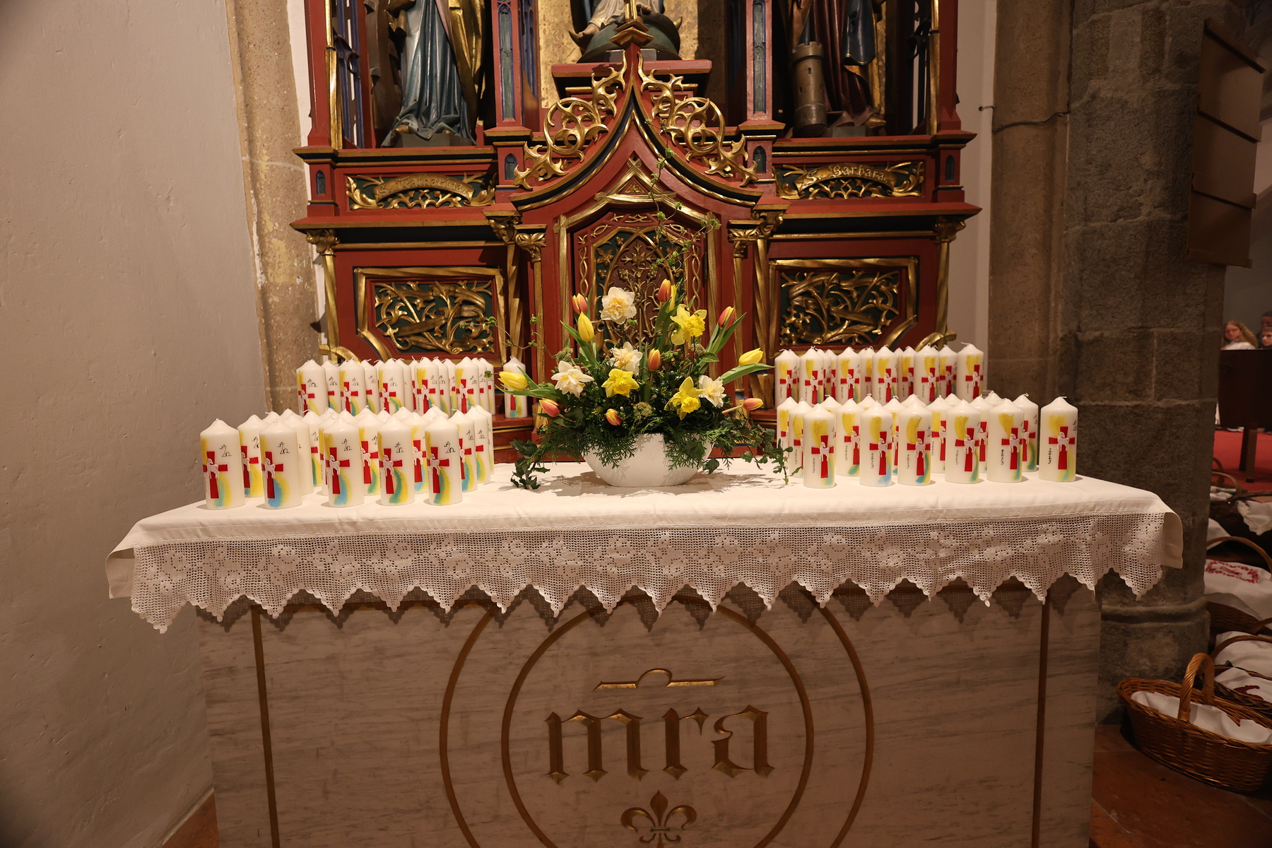 hat sie der Herr befreit zu einem neuen Sehen." Mit diesen Wort von Ralf Huning haben wir uns einleitend auf das wichtigste Geschehen dieser Nacht hingeführt: Gott führt aus dem Dunkel in das Licht. Die Minis ratschen am Beginn noch, weil die Instrumente und Glocken noch schweigen - ehe dann im Gottesdienst das volle Glockengeläut erklang. Hörbares Zeichen für das Auferstehen. Sichtbares Zeichen für die Auferstehungsbotschaft waren heuer besonders neben der großen Osterkerze die Miniaturosterkerzen.