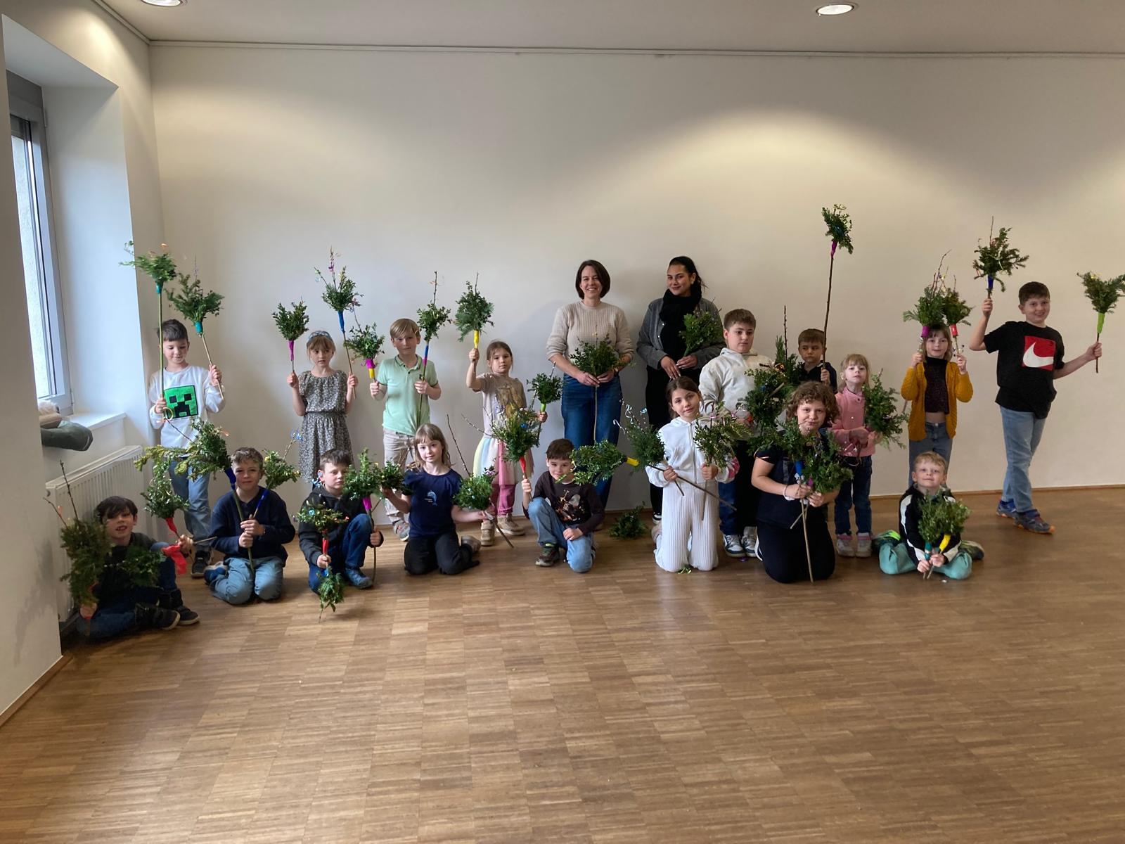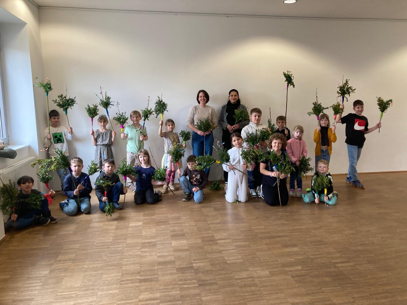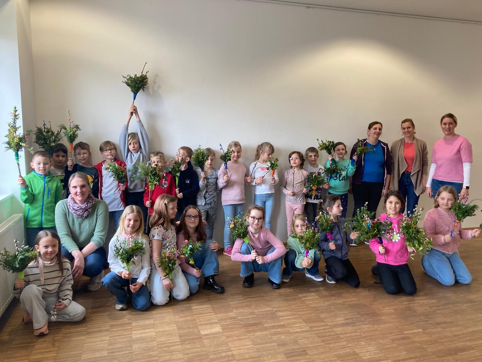 Mit ihren selbst gebundenen Palmbuschen bereiten sich die Kinder nun auf die Karwoche und das Osterfest vor.