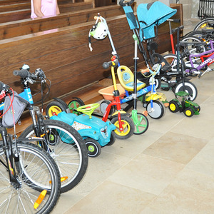 Von Fahrrädern bis hin zu Spieltraktoren waren viele Kinderfahrzeuge im Kirchenschiff aufgestellt, die unsere Wortgottesdienstleiterin Martha Steiner segnete.