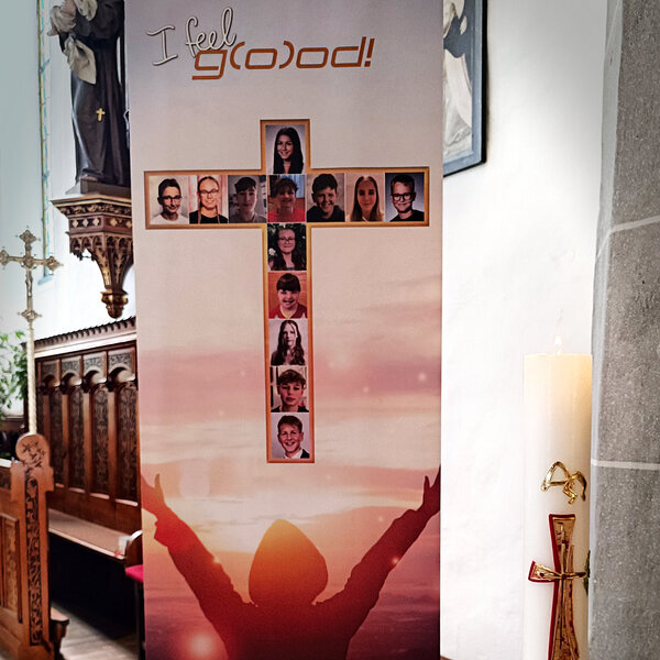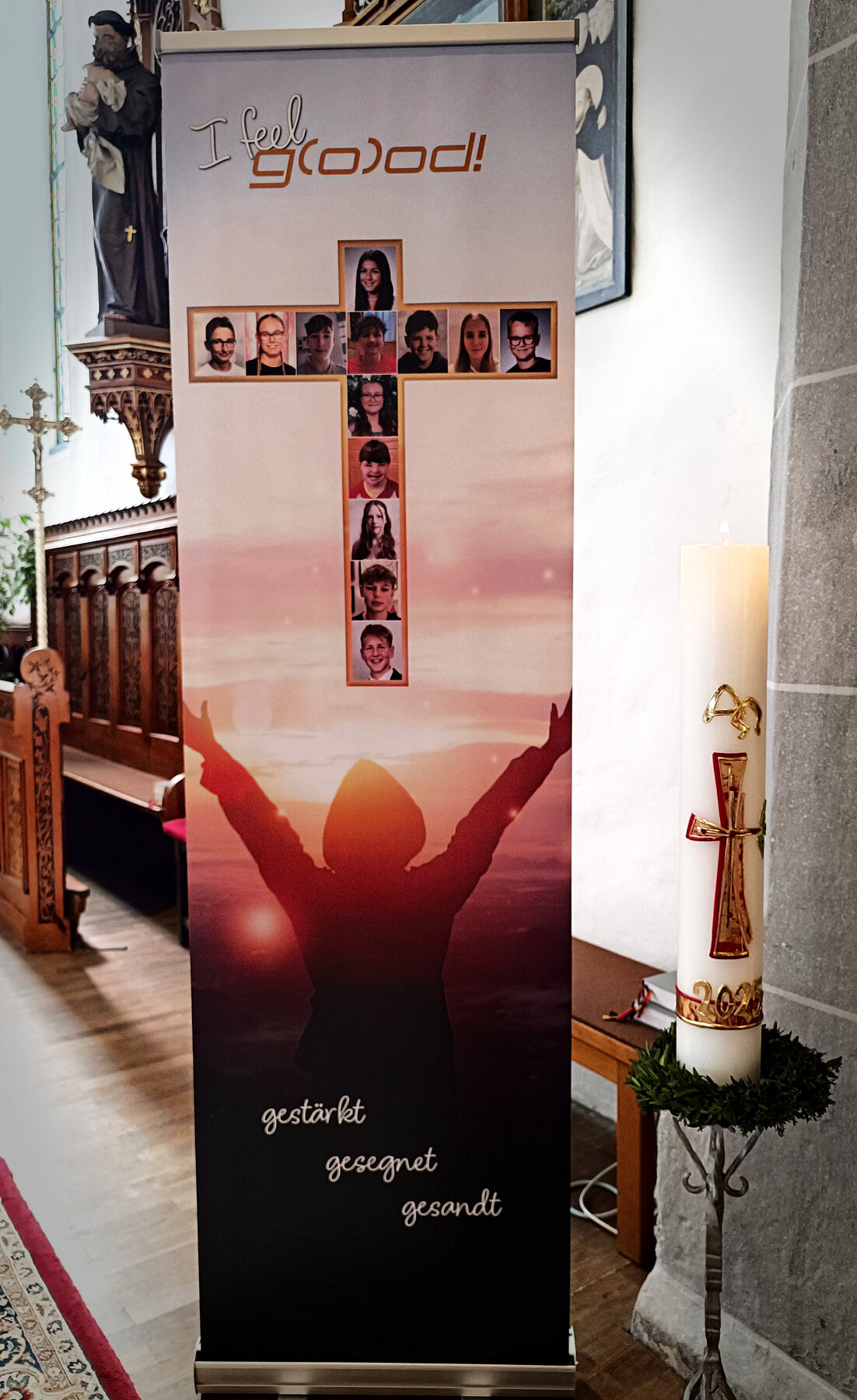 Die Vorstellmesse fand bereits statt und in der Kirche sind die Firmkandidaten auf einem Roll-up zu sehen.