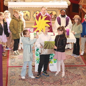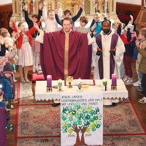 Da das heurige Fest der Erstkommunion unter dem Motto "Jesus- unser Lebensbaum, der uns Halt gibt und uns trägt" stattfindet, wurde nicht nur ein passendes Plakat mit den Bildern der Kinder gestaltet und präsentiert, sondern auch ein echter Baum mit den Fotos der Erstkommunikanten geschmückt.