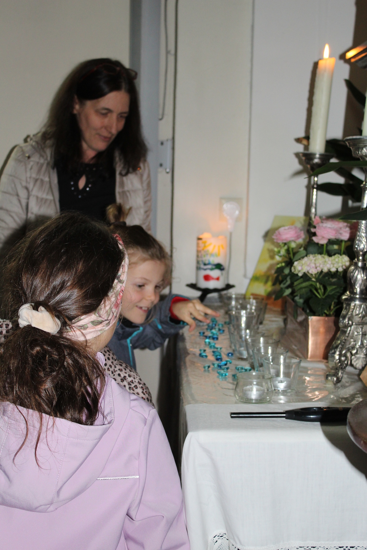 Beim Eingang der Kirche erhielten die Kinder einen Kieselstein, welchen sie während der Andacht am Marienaltar gegen einen „Edelstein“ tauschen durften. Maria verwandelt unsere Ängste und Sorgen in Hoffnung und Zuversicht.