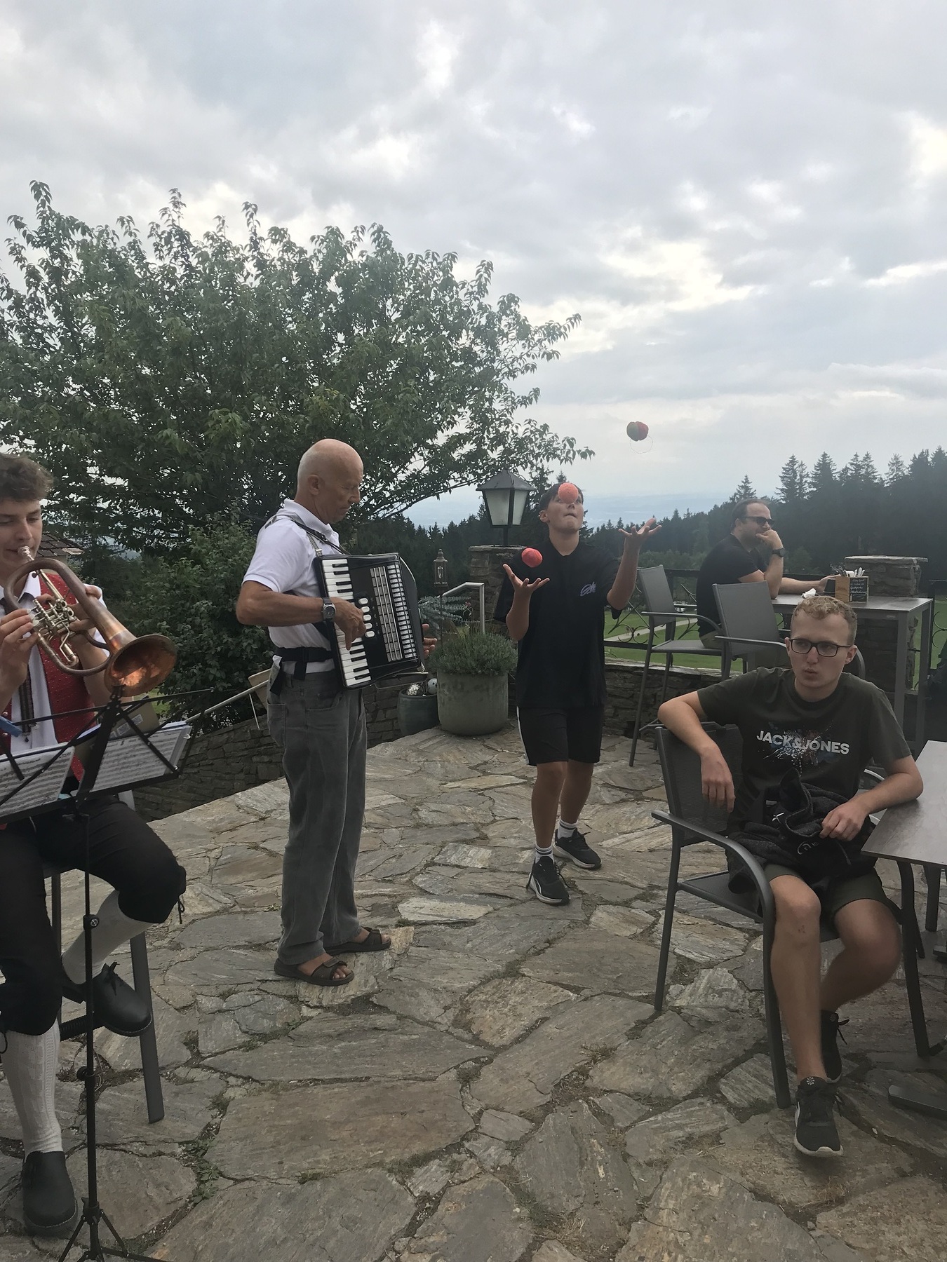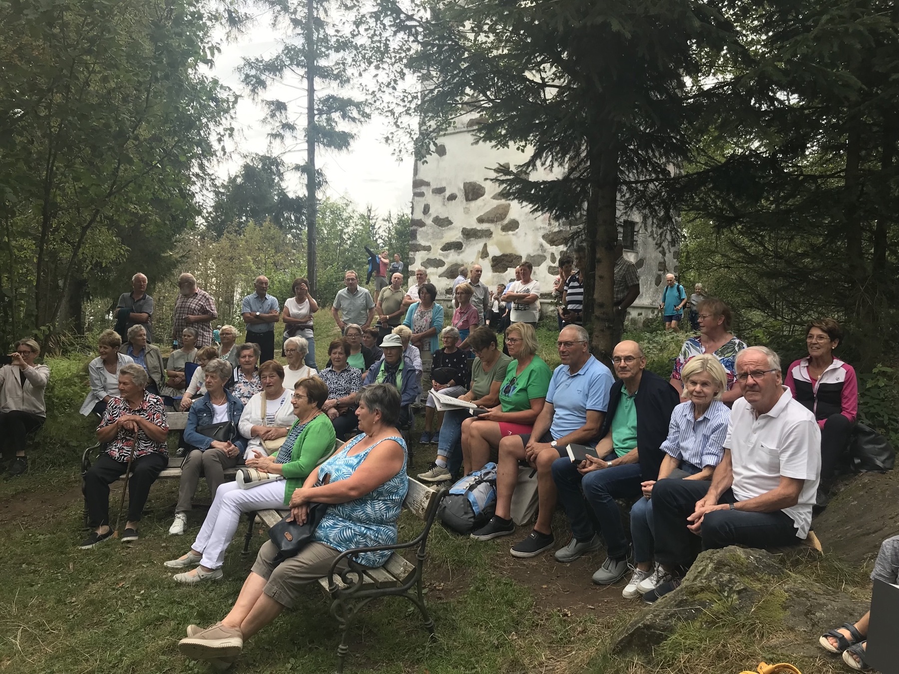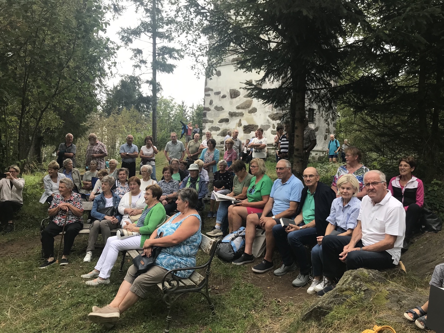 Einige Mountainbiker und Wanderer machten immer wieder mal halt und feierten mit. Im Anschluss konnten wir uns im Wirtshaus zur Gis stärken. Den Nachmittag genossen viele Teilnehmer auf der Terrasse, wo natürlich musiziert und jongliert wurde. Manche nutzten aber auch die Gelegenheit und wanderten weiter zur Eidenberger Alm. Ein großer Dank gilt unserem Organisator Baumgartner Hans sowie unserem Chauffeur Pfarrer Walter Miggisch.