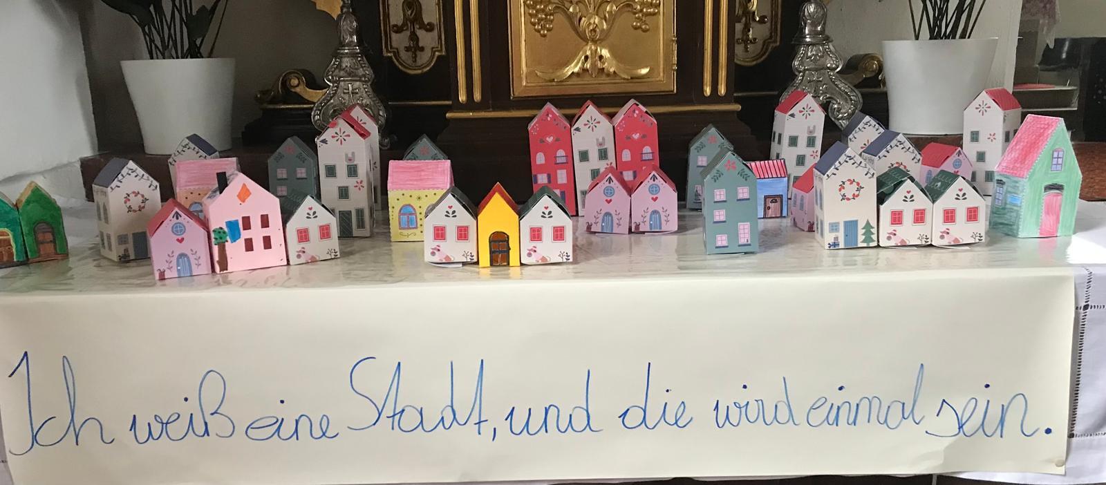 "Ich weiß eine Stadt, und die wird einmal sein!", lautet die heurige Kinderaktion. Die Stadt, welche am Marienaltar entstehen wird, hat bereits bunte Häuser.
