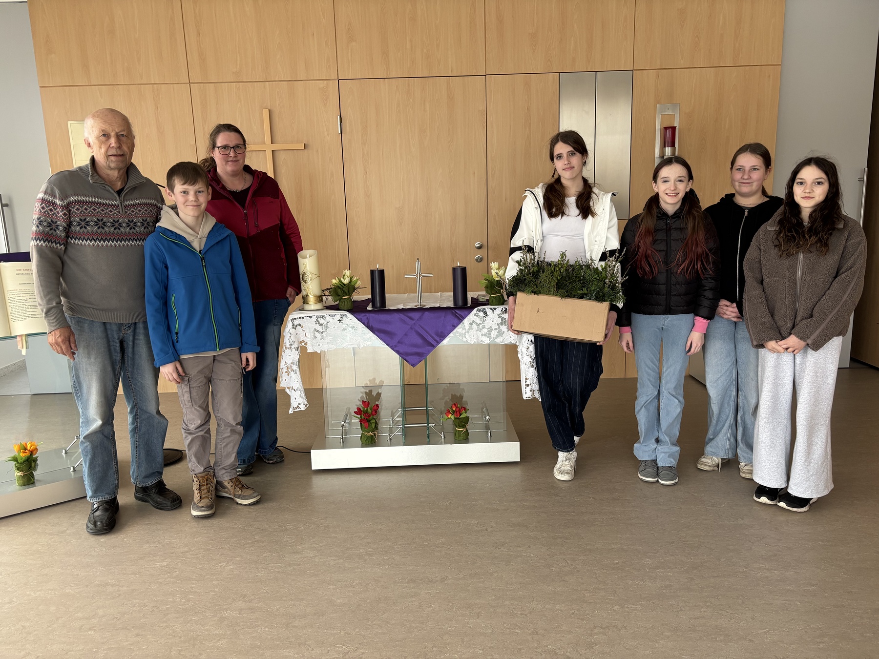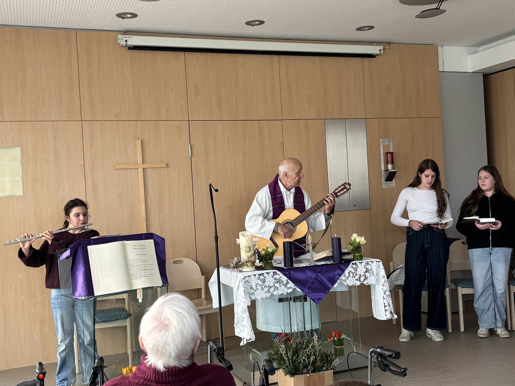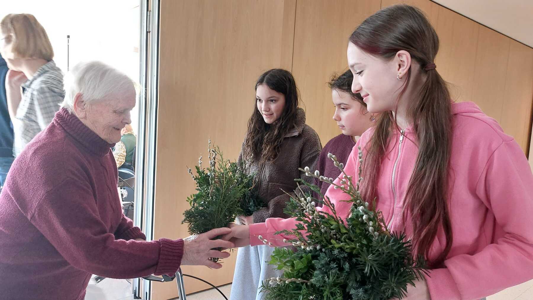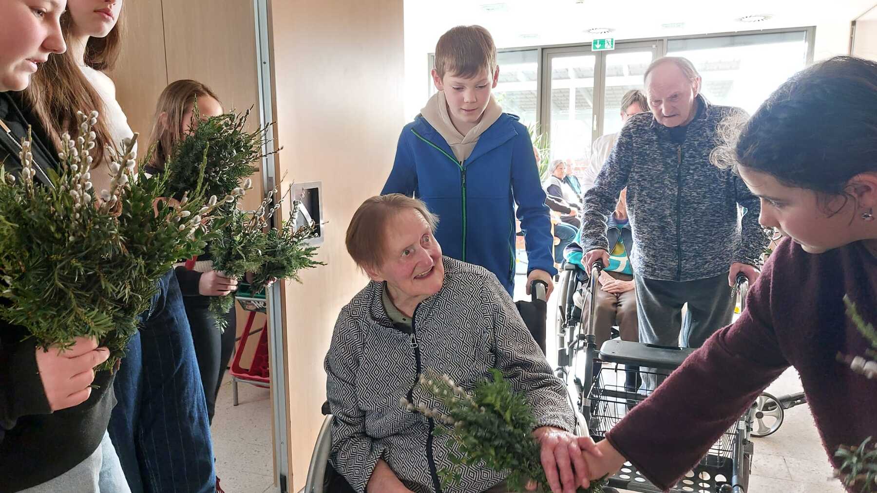 Stefanie Sickinger hat auf Eigeninitiative gemeinsam mit zwei Firmlingen 30 kleine Palmbuschen gebunden und diese an die Bewohnerinnen und Bewohner verteilt. Außerdem nahm Antonia ihre Querflöte mit und begleitete unseren Gesang während der Messe.