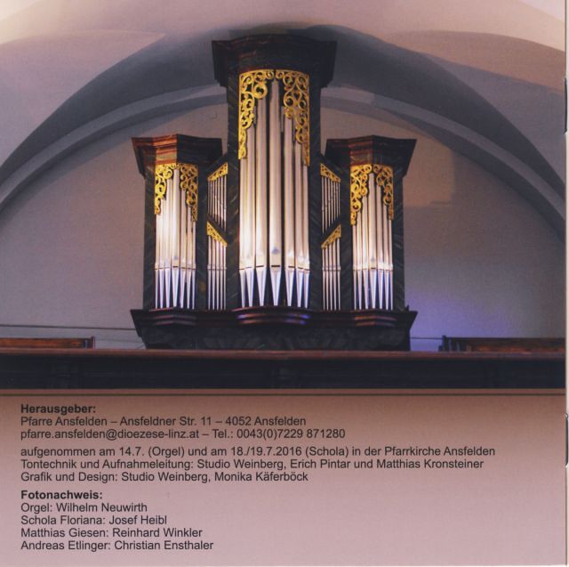 Ich freue mich über das Zustandekommen dieser musikalischen Dokumentation im Gedenken an den großen Ansfeldner Anton Bruckner. Beim Gottesdienst am Sonntag, 30. Oktober 2016 um 9:00 Uhr sang die Schola Floriana und Andreas Etlinger spielte die Orgel. Die CD wurde an diesem Sonntag präsentiert und zum Kauf angeboten.