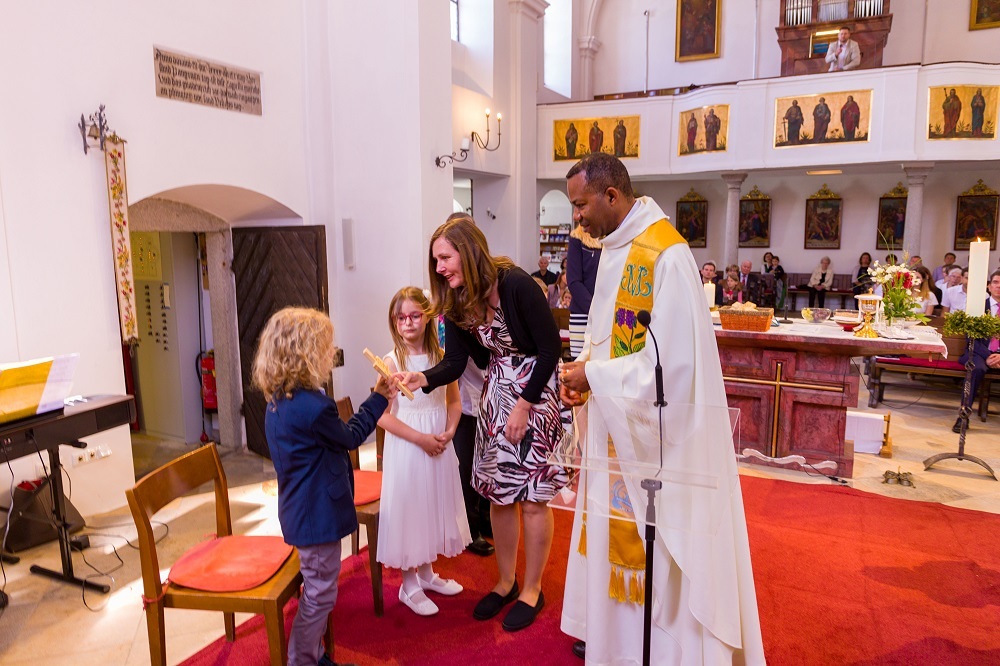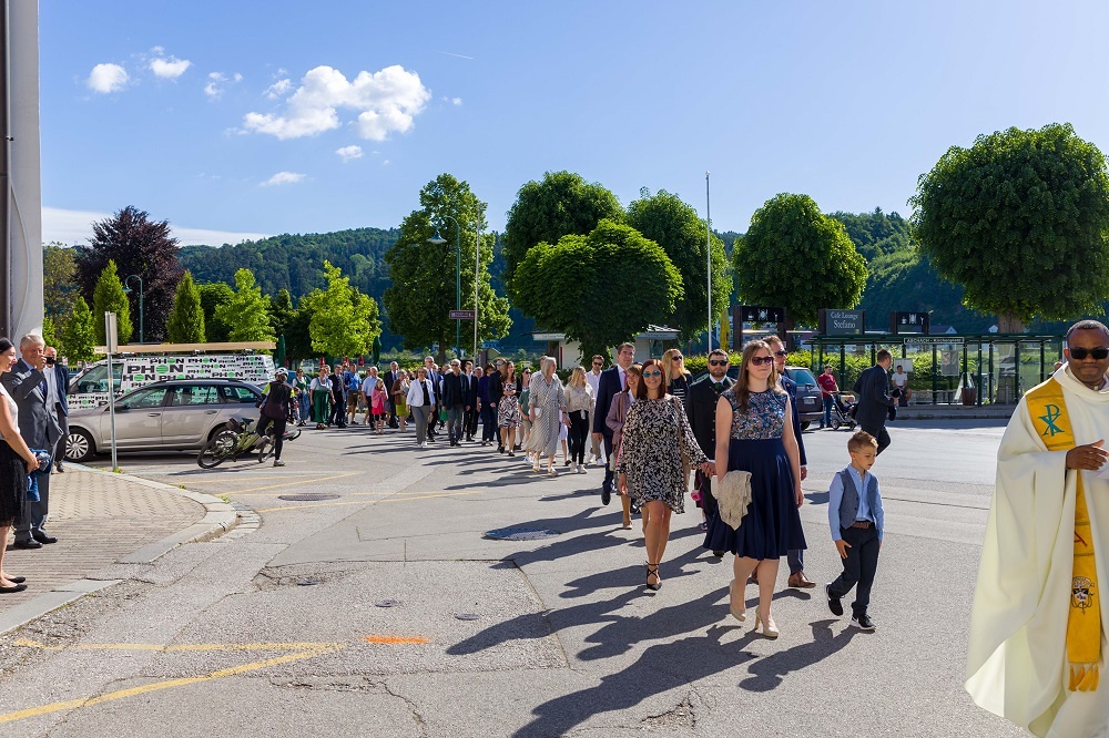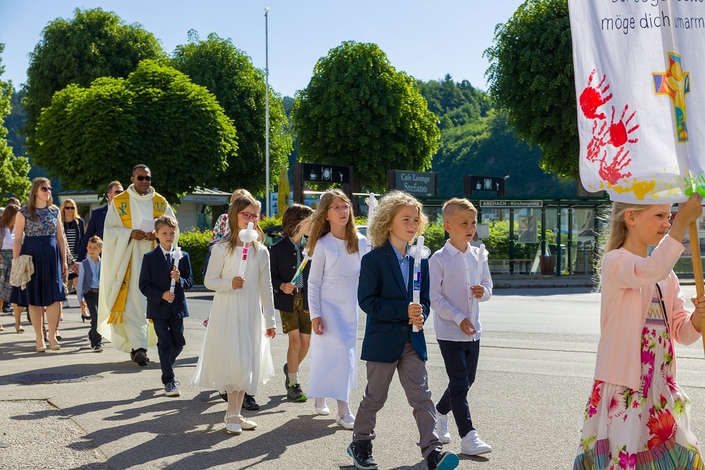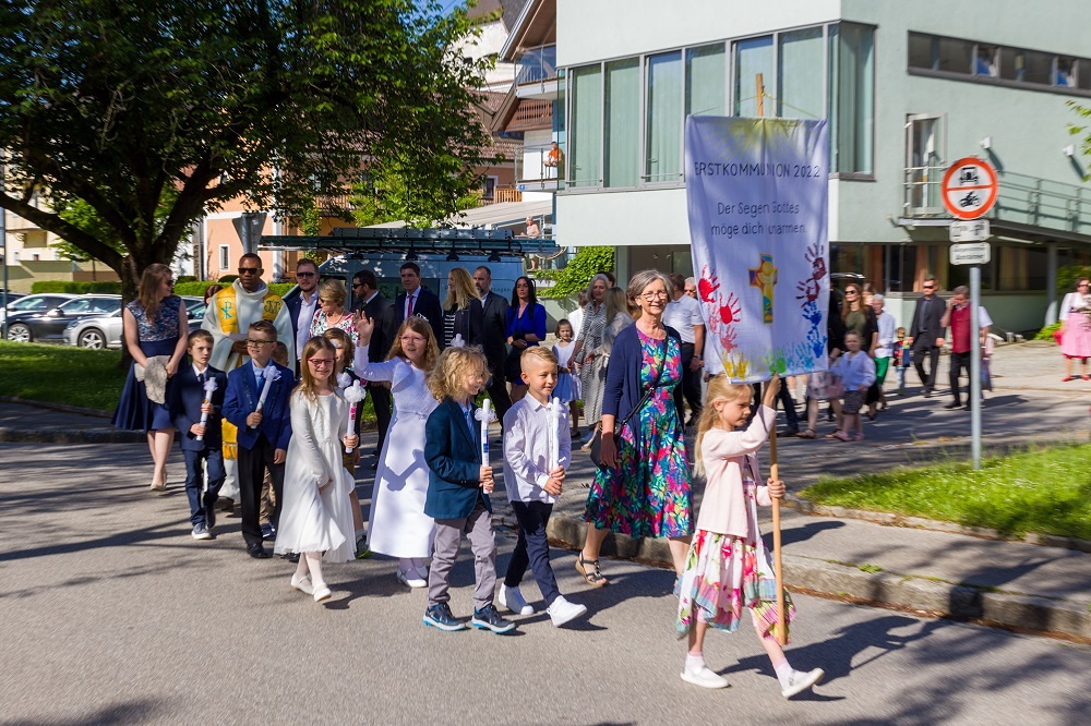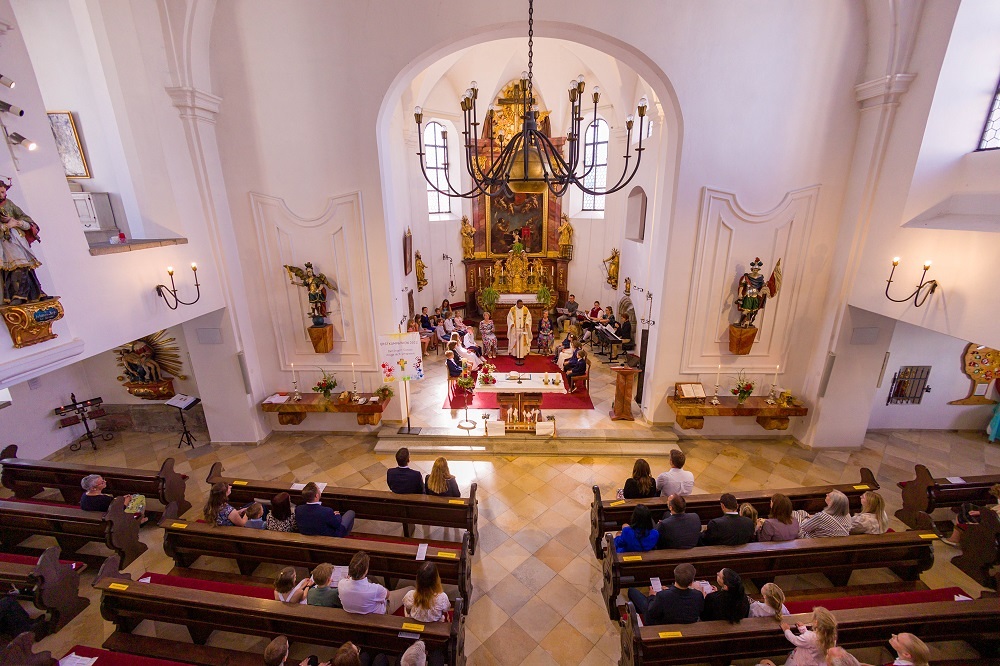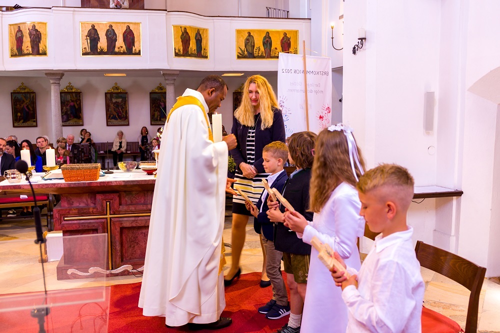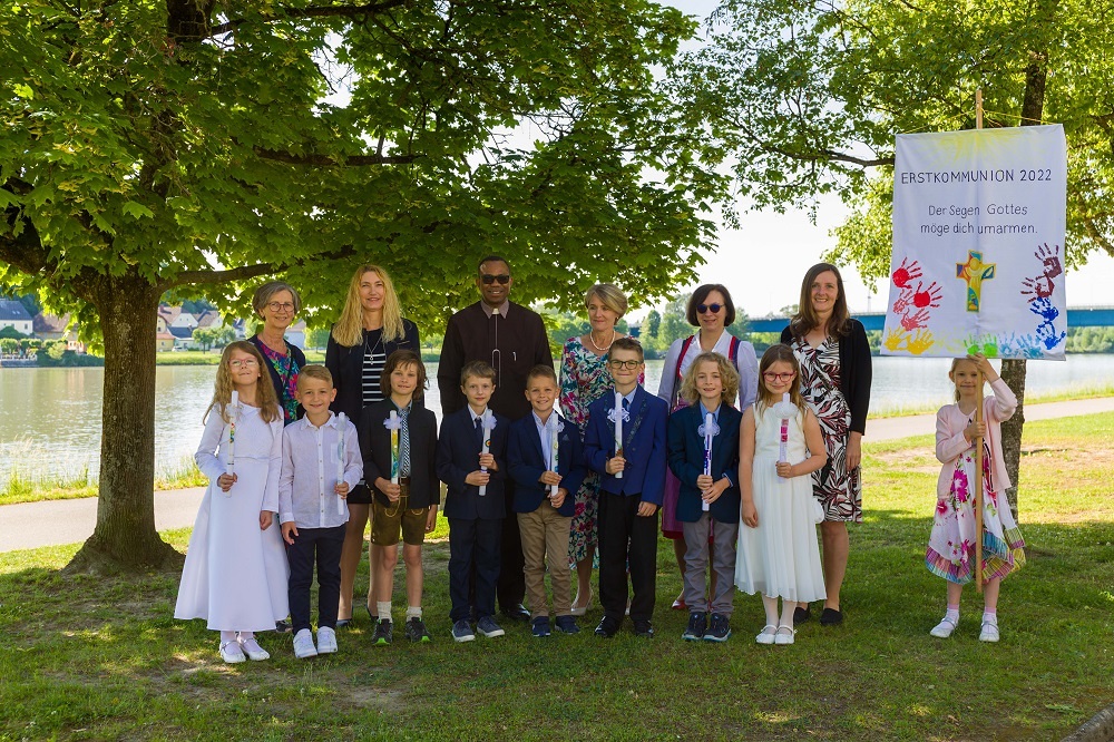 Von unserem Treffpunkt beim Pfarrzentrum begleitete uns die Musikkapelle entlang der Donau zur Kirche. Nach einem sehr feierlichen Gottesdienst mit der ersten Heiligen Kommunion für unsere acht Kinder wurde jedes Kind von Pfarrer Paulinus besonders gesegnet. Die Tischmütter überreichten die Erstkommunionandenken. Danach erwartete alle – Kinder und Gäste – ein liebevoll bereitetes Frühstück im Pfarrzentrum.
