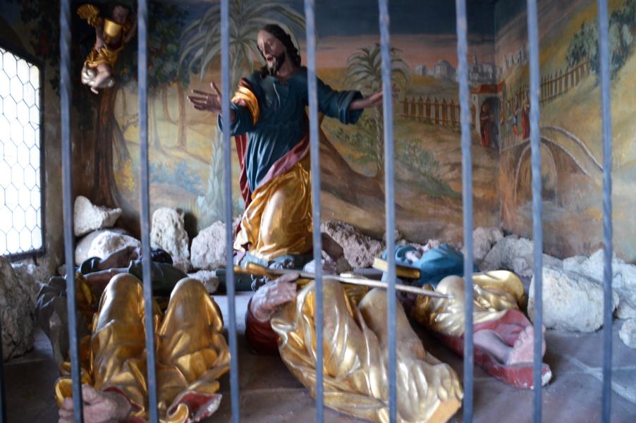 Nach dem Letzten Abendmahl geht Jesus zum Garten Getsemani am Ölberg. Er bittet die Jünger Petrus, Jakobus und Johannes zu wachen und zu beten, während er in Todesangst betet. Doch dreimal findet er sie schlafend. Hernach erfolgt der Verrat durch Judas und die Verhaftung durch die Soldaten. Die Szene von den schlafenden Jüngern - aus der Zeit um 1770 - ist beim Haupteingang links dargestellt.