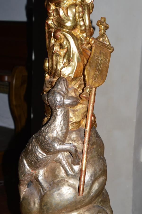 Der kunstvolle Sockel, der unsere Osterkerze trägt, zeigt die Fratze des Todes und darüber das Osterlamm, das den Tod besiegt. In barocker Art geschnitzt von Manfred Daringer.